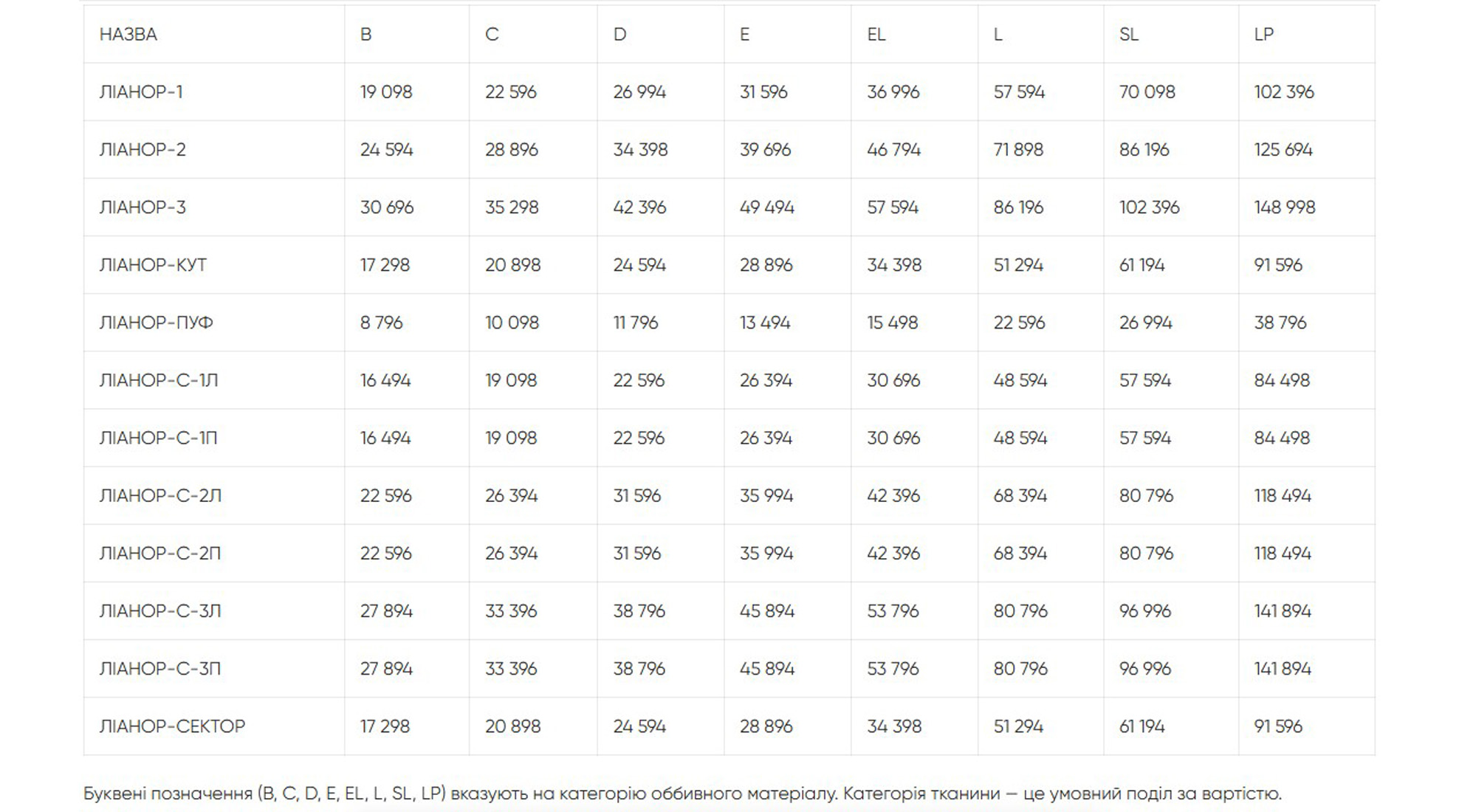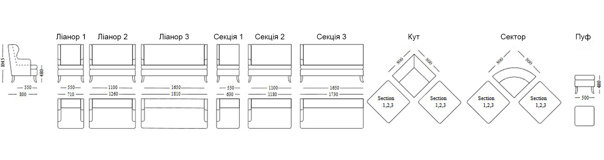 Підлокітники з зовнішньої сторони і м'які подушки сидіння декоровані кантами. Ліанор - унікальна складова інтер'єру, здатна змінити зовнішній вигляд, настрій і характер приміщення. Серія складається з двох і тримісного дивана, крісла, пуфа, сполучних елементів «кут» і «сектор», секцій. За допомогою модулів формуються конфігурації різної форми і розмірів - це можливість презентувати цілісний і ексклюзивний проект.
