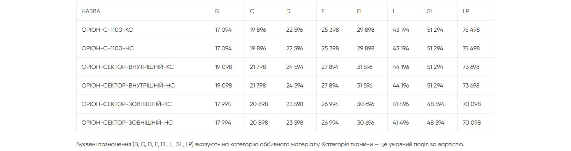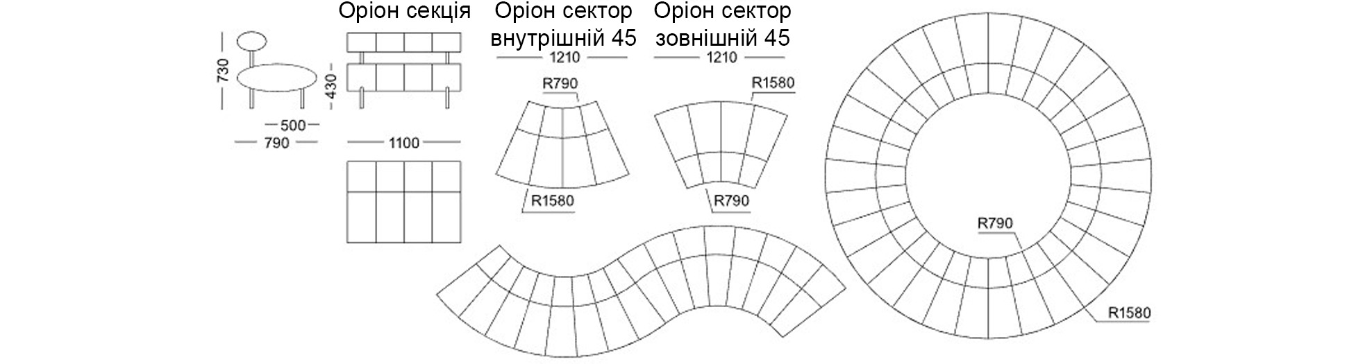 Футуристичний дизайн м'яких меблів Оріон (диван для готелю) - це плавні лінії, вивірена геометрична форма сидіння, витончена спинка, яка піднімається над сидінням на струнких регульованих металевих опорах. Лінії прошивки, ледь розсікаючи гладку поверхню дивана, ділять сидіння і спинку на чотири рівні частини, підкреслюючи овальні форми виробу. Особливо привабливо вони виглядають на секторах, коли практично з центра сектора розходяться промені декоративних строчок.