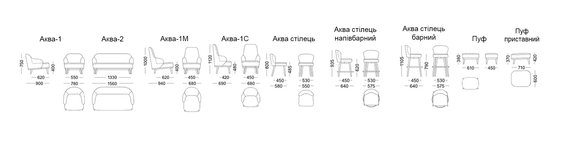 Серія Аква – одина з найяскравіших зразків дизайнерських меблів у каталозі. Вона відрізняється лаконічними і плавними лініями, спокійною кольоровою гамою та приємною фактурою оббивки. У моделі втілені сучасні меблеві тенденції. Посилання на ненав'язливу елегантність 50-х присутні у м'якому силуеті і продуманих деталях. Конструкція підтримується опорами з дерева – витонченими, але стійкими. Диван або крісло ідеально доповнить інтер'єри в стилі модерн, ар-деко, ретро та інших напрямках.