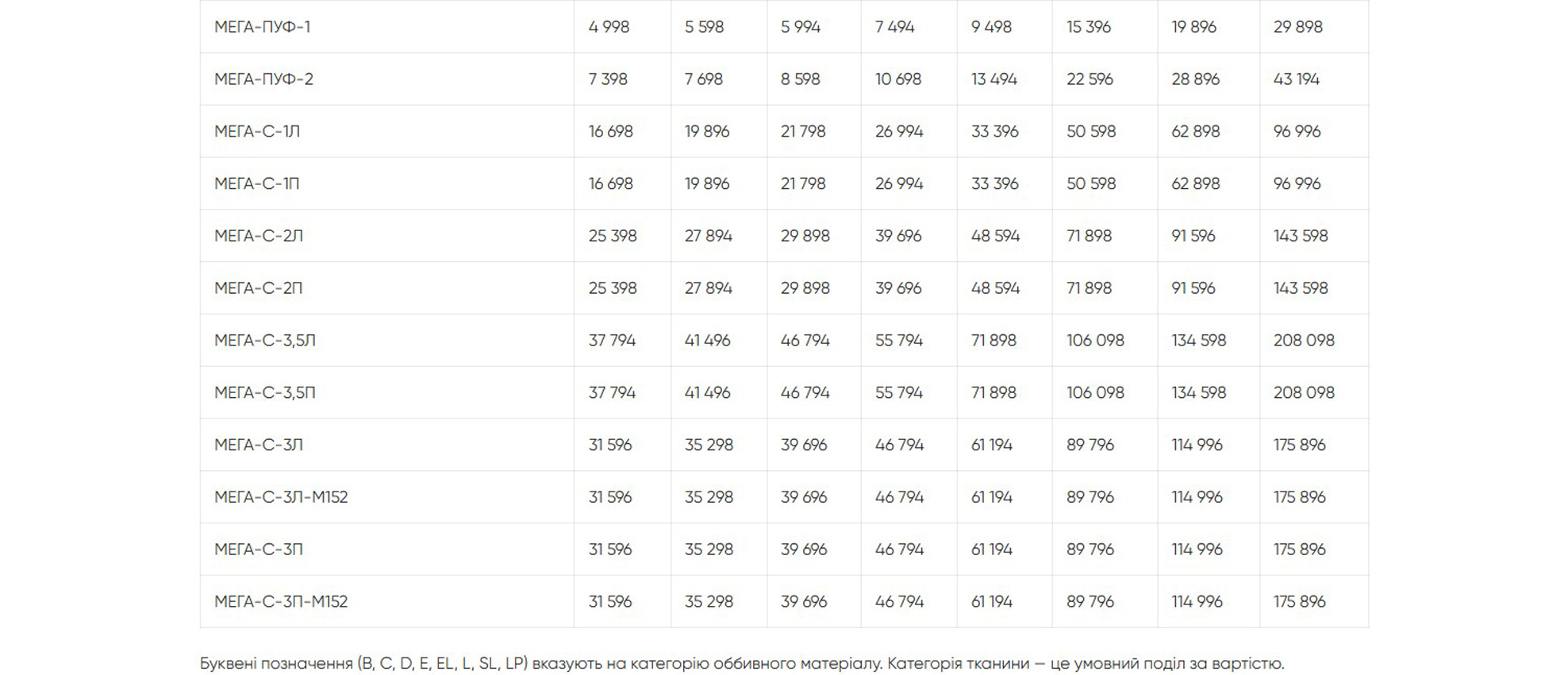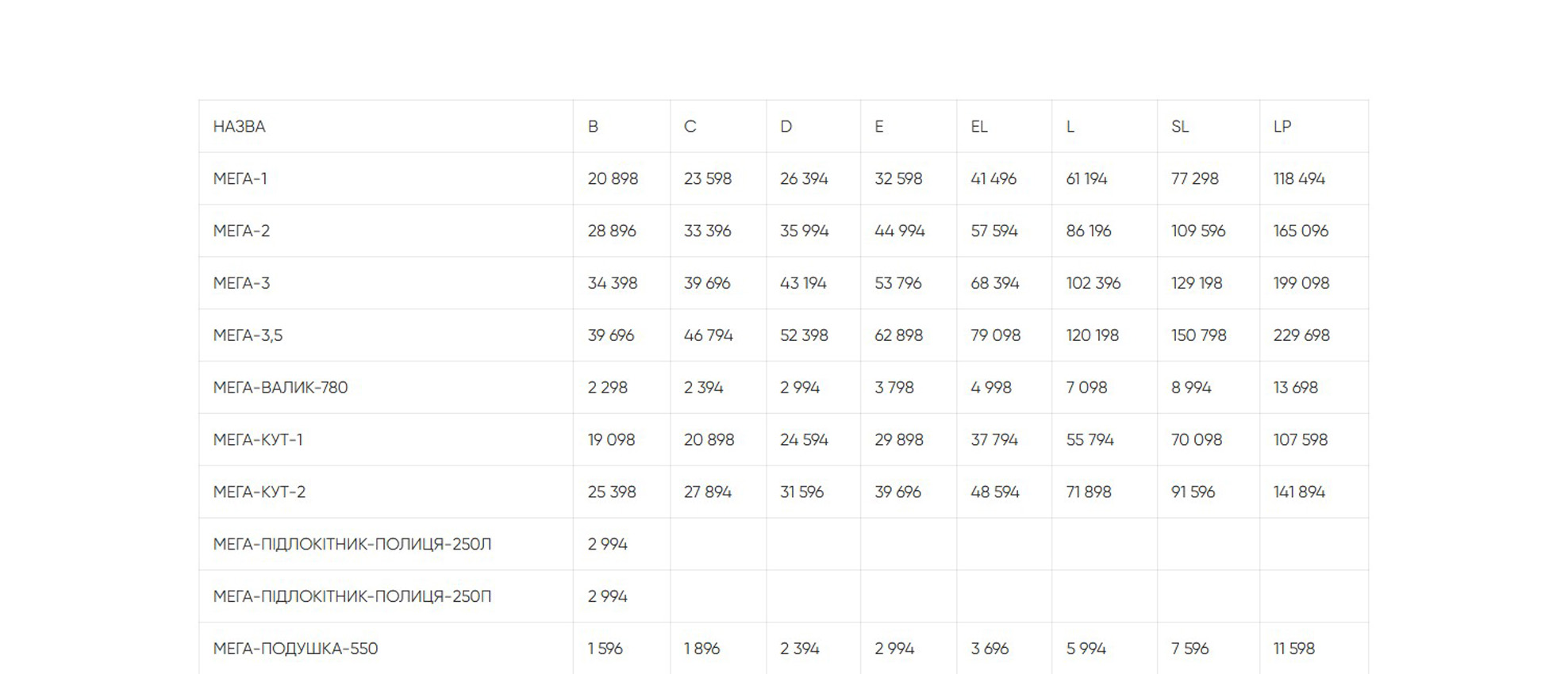 Крісло Мега-1: крісло Мега об'єднав в собі стиль і практичність. Залежно від планування приміщення можна ще підібрати підходящу довжину дивана, скласти кутовий варіант. М'які об'ємні подушки сидіння створюють умови для комфортного відпочинку. Декоративні подушки розставлять емоційні акценти. Варійована ширина підлокітників дозволяє додатково вмонтувати в підлокітник бар або полку, встановити на нього столик-підставку. У моделі передбачено механізм трансформації - «Мералат» або «Седафлекс». З секцій і кутового з'єднувального елемента можна скласти кутовий диван. При оснащенні кутового дивана розкладним механізмом суміжна секція може комплектуватися місцем для зберігання. Серія складається з крісла, дво-, тримісного дивану, тримісного дивану «лонг», одно-, дво-, тримісних секцій, тримісної секції «лонг», з'єднувального елемента «кут-1» або «кут-2», пуфа-1 або пуфа-2, декоративних подушок і валика.