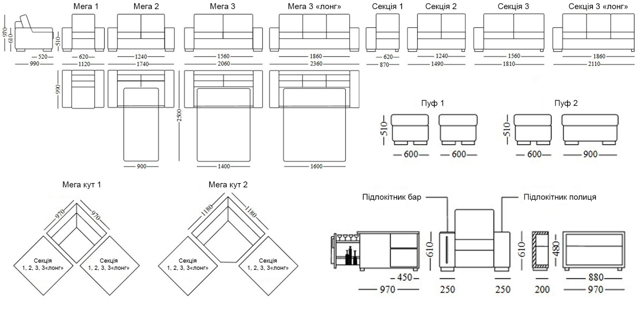 Крісло Мега-1: крісло Мега об'єднав в собі стиль і практичність. Залежно від планування приміщення можна ще підібрати підходящу довжину дивана, скласти кутовий варіант. М'які об'ємні подушки сидіння створюють умови для комфортного відпочинку. Декоративні подушки розставлять емоційні акценти. Варійована ширина підлокітників дозволяє додатково вмонтувати в підлокітник бар або полку, встановити на нього столик-підставку. У моделі передбачено механізм трансформації - «Мералат» або «Седафлекс». З секцій і кутового з'єднувального елемента можна скласти кутовий диван. При оснащенні кутового дивана розкладним механізмом суміжна секція може комплектуватися місцем для зберігання. Серія складається з крісла, дво-, тримісного дивану, тримісного дивану «лонг», одно-, дво-, тримісних секцій, тримісної секції «лонг», з'єднувального елемента «кут-1» або «кут-2», пуфа-1 або пуфа-2, декоративних подушок і валика.