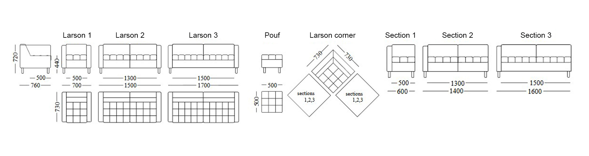 Диван Ларсон гарне рішення для облаштування офісу, витончена спинка і підлокітники гармоніюють з об'ємною подушкою сидіння прикрашеним декоративним рядком в формі квадратів. Втяжки на перетинах рядків дозволяють довше підтримувати зовнішній вигляд сидіння у відмінному стані. Опори роблять з нержавіючої сталі або алюмінієвого профілю з полімерним покриттям. Наявність з'єднувального елемента дозволяє складати кутові композиції.