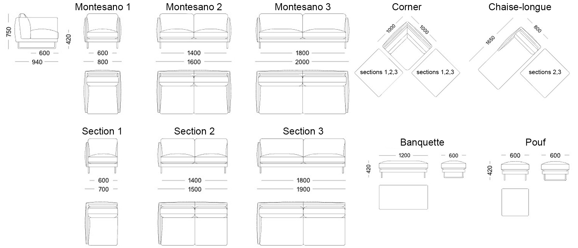 Диван Монтесано-2 має безліч сценаріїв застосування — офіс, кабінет, вітальня в будинку, лаунж-зона, салон краси або інші громадські місця. Посадка середня. Сидіння зроблено із твердого настилу. На ньому, а також у спинці, розташовані м'які подушки, за рахунок чого виріб набуває форми тіла та забезпечує комфортний відпочинок. Чохли подушок знімні — практична деталь, завдяки якій процес прибирання стає легким.