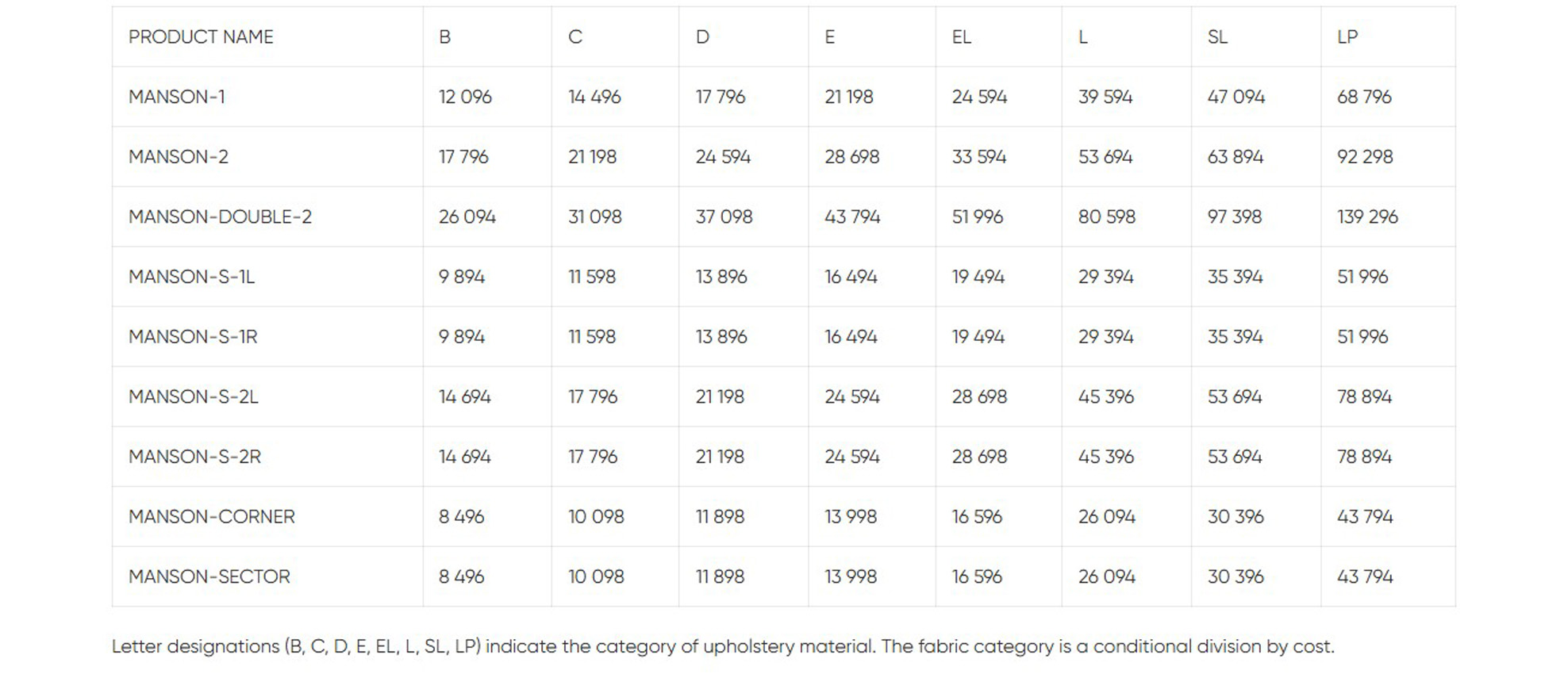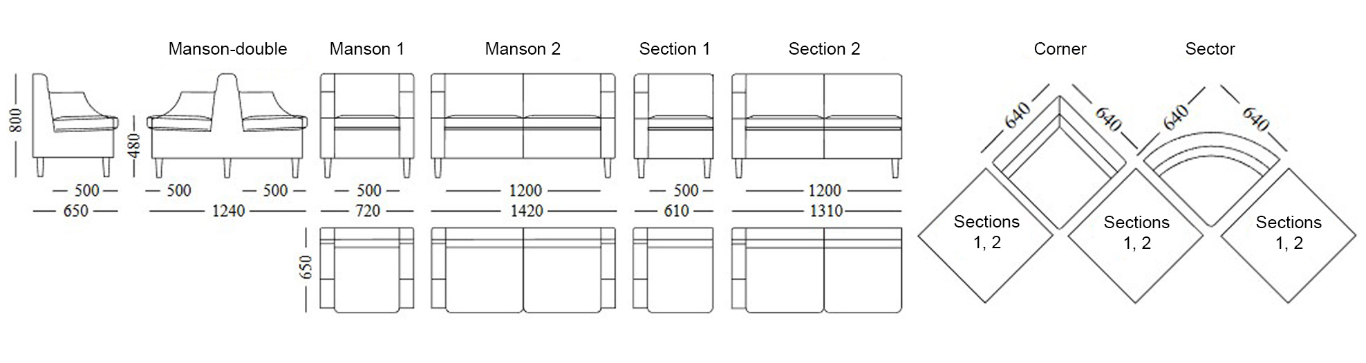 Меблі мають чудові експлуатаційні характеристики. Менсон - це ідеальні дивани (крісла) для барів та кафе. Вони якісні та довговічні, і незалежно від того, скільки гостей приходить до вас кожен день, багато років зберігають бездоганний вигляд. Серія складається з крісла, двомісного дивана, одно- і двомісної секцій, сполучних елементів «кут» і «сектор». За допомогою кутових модулів виходять унікальні конфігурації різних форм і розмірів. Можливе виконання «дабл» - цю опцію оцінять власники компаній в сфері обслуговування.
