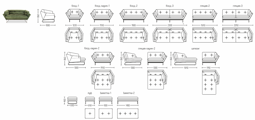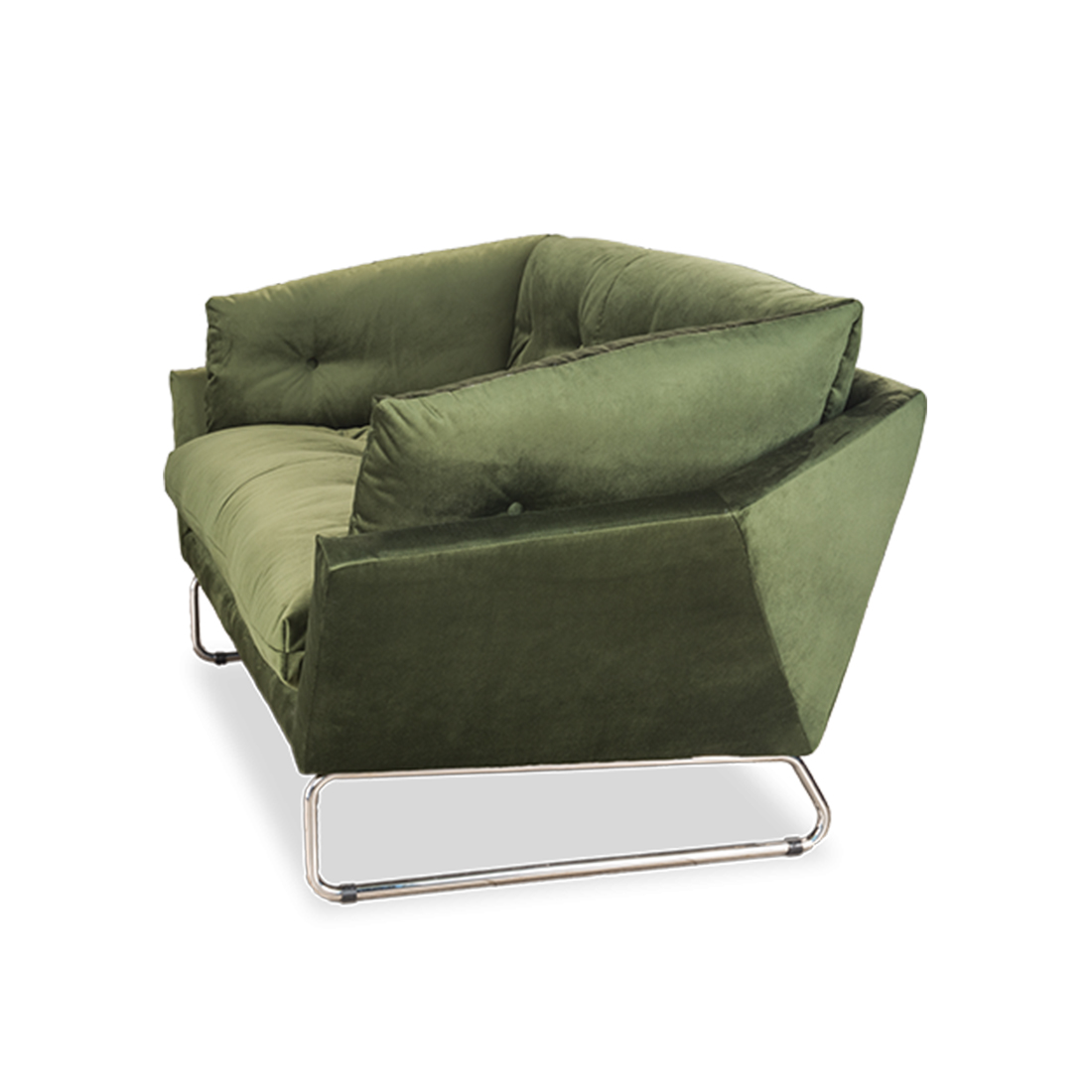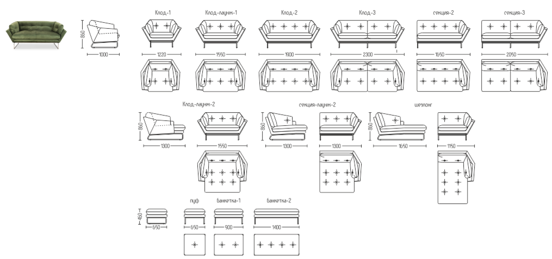 Подушки знімні, обшиті основною тканиною. Наповнювач розподілений таким чином, що ППУ знаходиться в центрі подушки, а "аеропух" з боків - це робить модель повітряної і дуже м'якою. Диван зносостійкий і довговічний завдяки використанню кращих матеріалів виробництва. Внутрішній каркас виготовлений з фанери і ДВП, а зовнішній з нержавіючої або пофарбованої сталі. Тип і колірне рішення оббивного матеріалу також залишається за Вами.