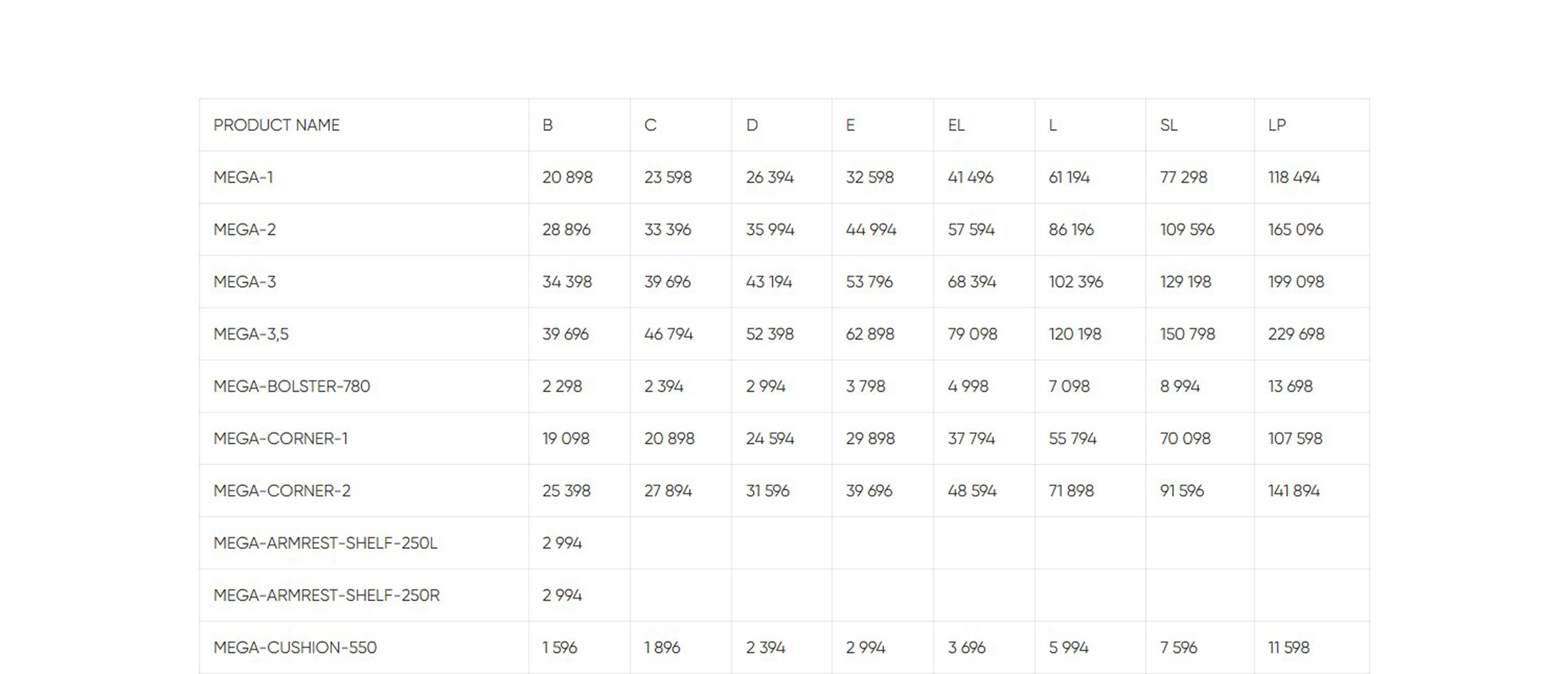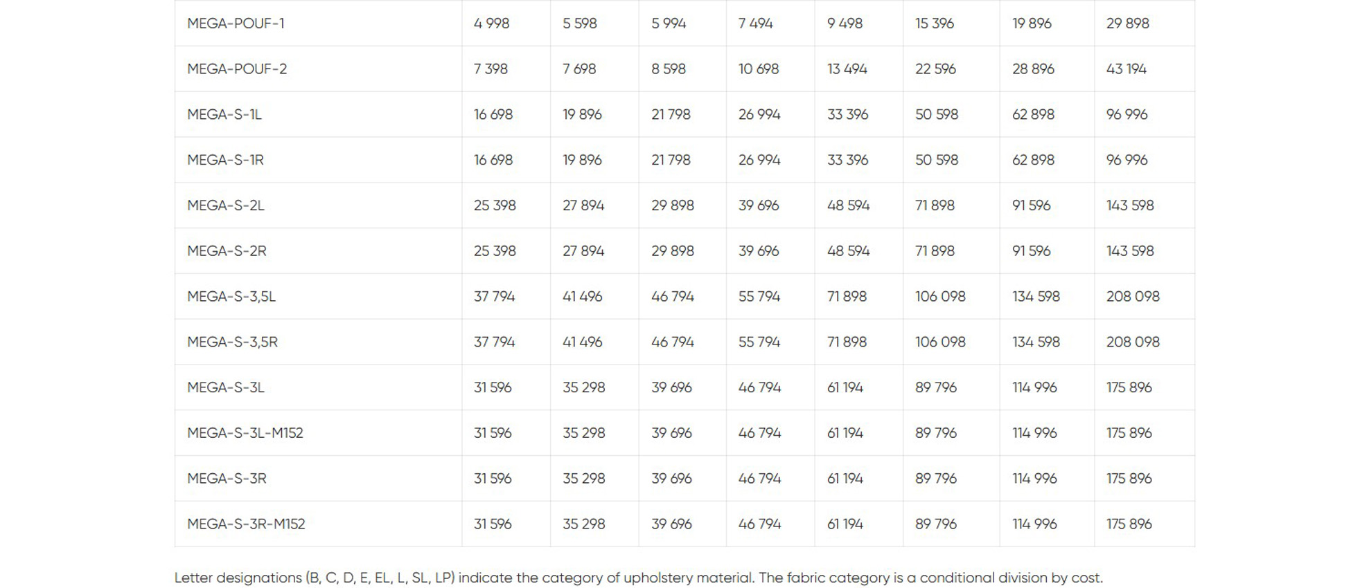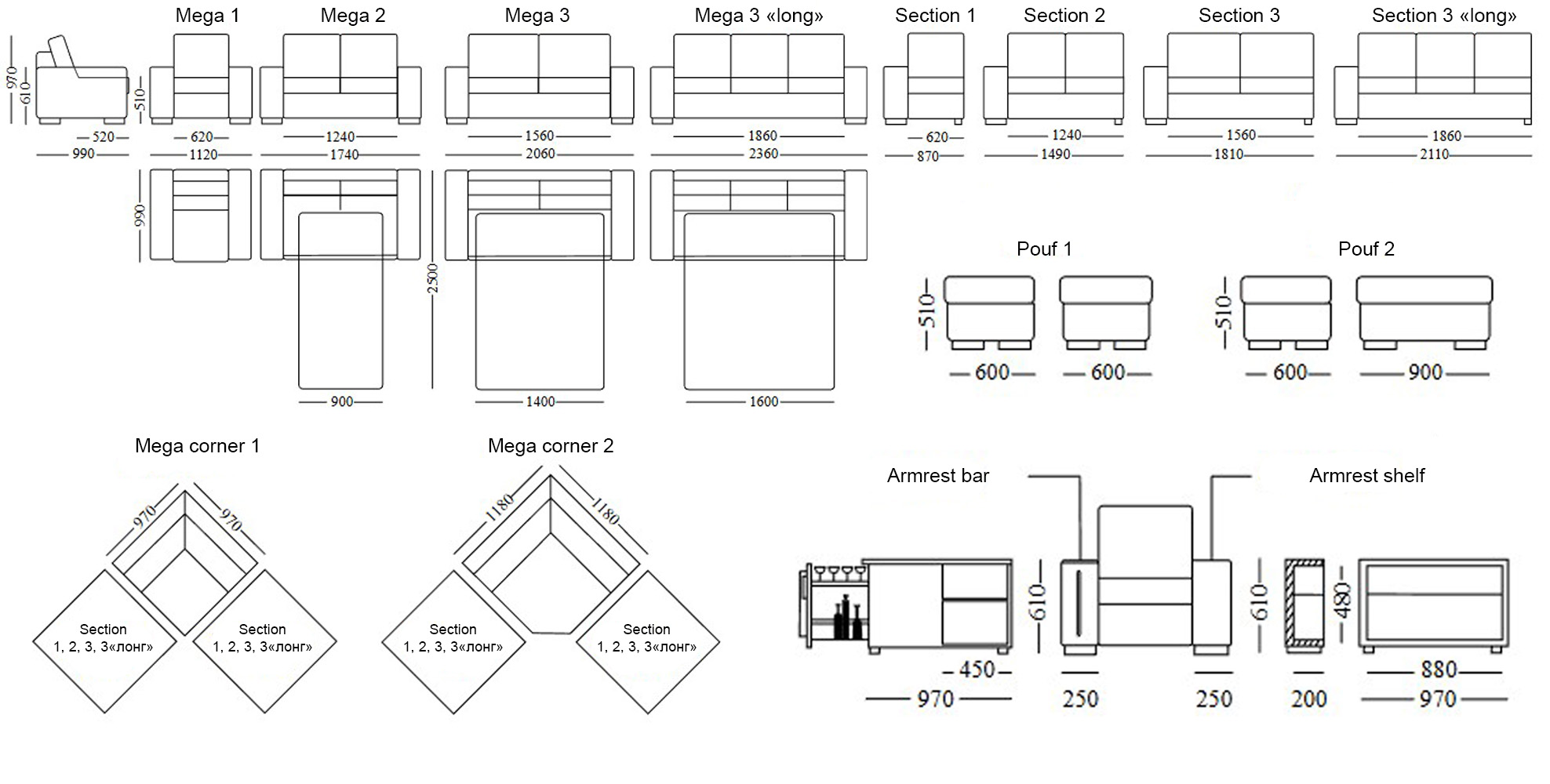 Диван Мега-2: двомісний диван Мега об'єднав в собі стиль і практичність. Залежно від планування приміщення можна ще підібрати підходящу довжину дивана, скласти кутовий варіант. М'які об'ємні подушки сидіння створюють умови для комфортного відпочинку. Декоративні подушки розставлять емоційні акценти. Варійована ширина підлокітників дозволяє додатково вмонтувати в підлокітник бар або полку, встановити на нього столик-підставку. У моделі передбачено механізм трансформації - «Мералат» або «Седафлекс». З секцій і кутового з'єднувального елемента можна скласти кутовий диван. При оснащенні кутового дивана розкладним механізмом суміжна секція може комплектуватися місцем для зберігання. Серія складається з крісла, дво-, тримісного дивану, тримісного дивану «лонг», одно-, дво-, тримісних секцій, тримісної секції «лонг», з'єднувального елемента «кут-1» або «кут-2», пуфа-1 або пуфа-2, декоративних подушок і валика.