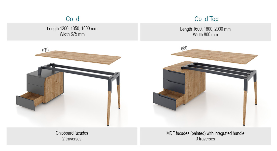 Furniture for executives Compound TOP (Compound TOP/Co_d TOP) - a great solution for organizing a modern office for an executive in an eco-style. Tables on metal supports create a visual lightness of space, colored details add colors to the stylish design. A feature of the Co_d TOP collection is the legs made of solid ash. Ash has such characteristics as hardness, durability and a special golden hue. Thanks to its use, tables in the Co_d TOP series have beautiful and elegant supports. Co_d - the concept of a new generation of office furniture - environmental friendliness, conciseness, functionality.