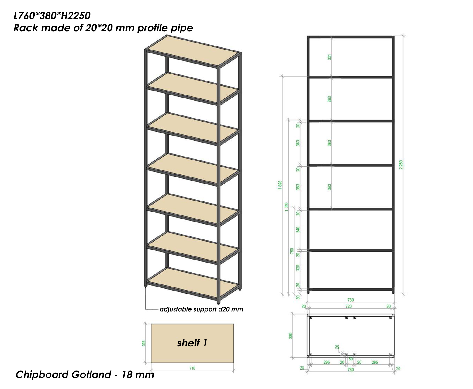 | Additional features | The thickness of the frame pipe is 20*20 mm, the shelves are 18 mm chipboard. |