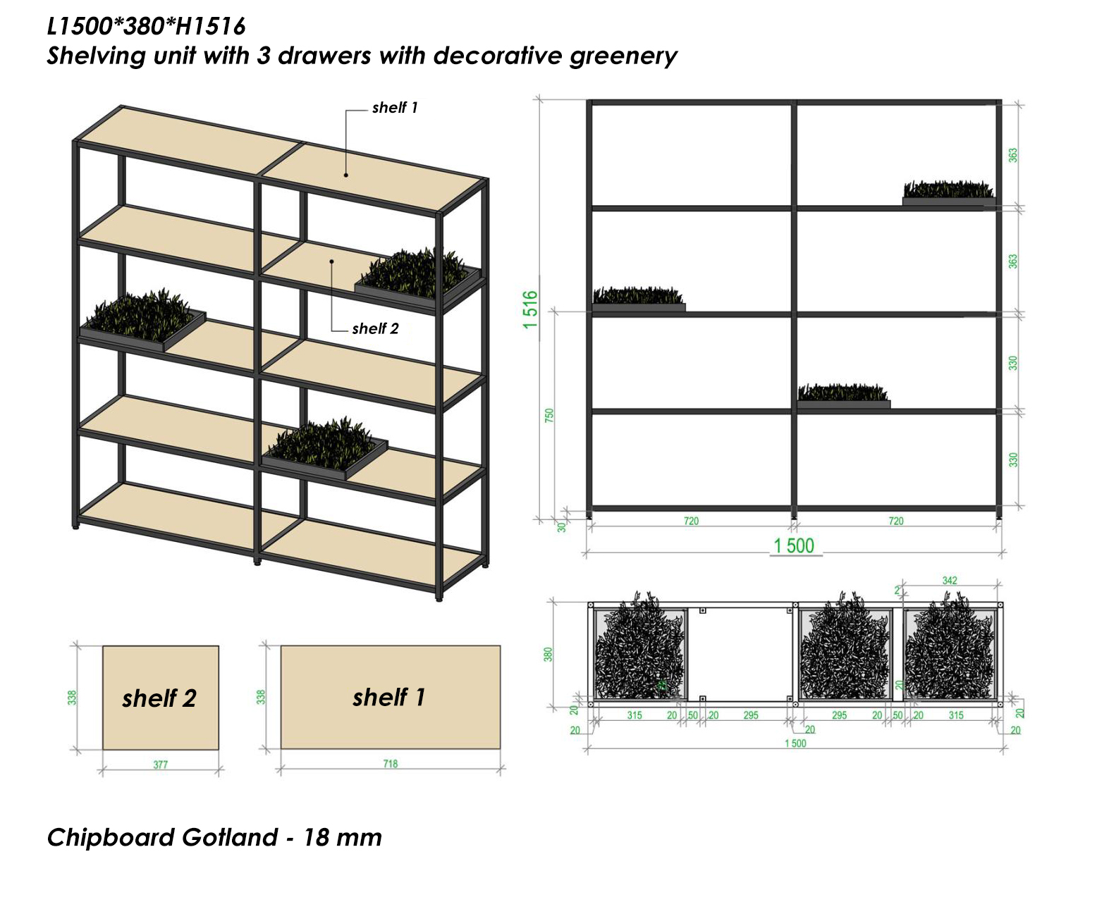 | Features | Box with decorative grass — 3 pcs (338*338*50h), placed as an extension of the shelf |