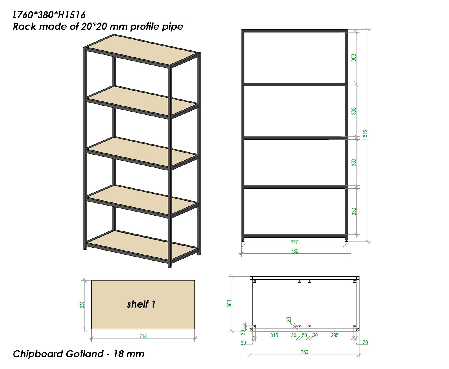 | Additional features | The thickness of the frame pipe is 20*20 mm, the shelves are 18 mm chipboard. |