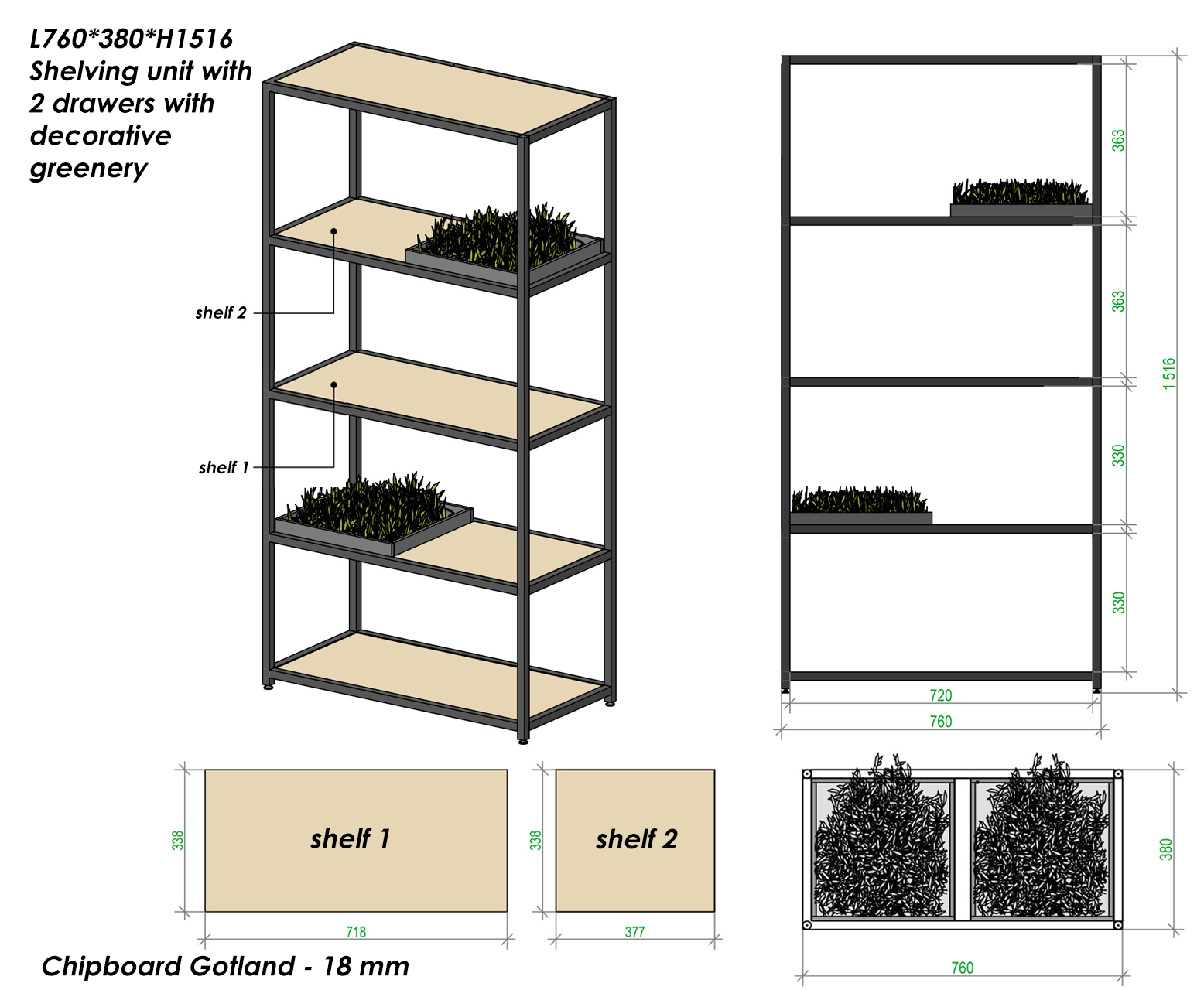 | Features | Box with decorative grass — 2 pcs (338*338*50h), placed as an extension of the shelf |