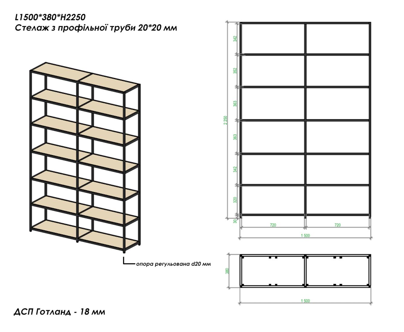 - Розмір: довжина — 1500 мм, ширина/глибина — 380 мм, висота — 2250 мм.