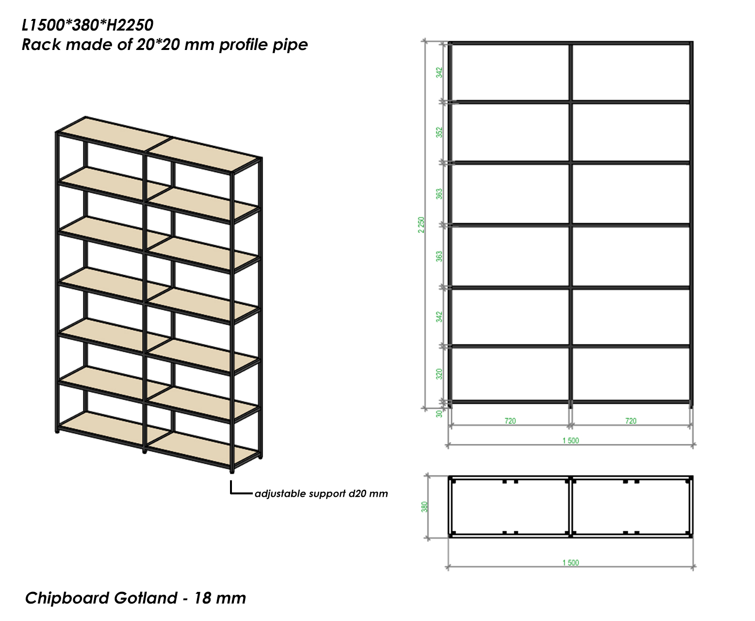 | Additional features | The thickness of the frame pipe is 20*20 mm, the shelves are 18 mm chipboard |