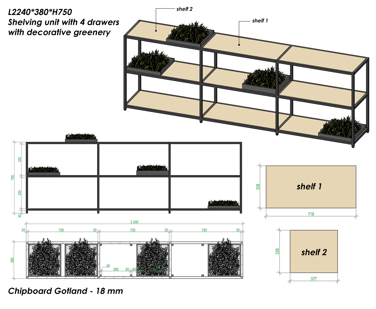 | Features | Box with decorative grass — 4 pcs (338*338*50h), placed as an extension of the shelf |