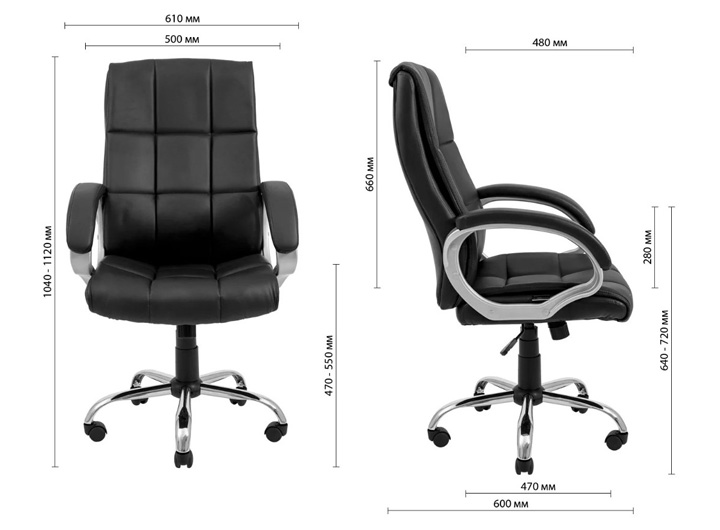 Висота виробу в нижньому положенні: 1040 мм Висота виробу в верхньому положенні: 1120 мм Висота сидіння в нижньому положенні: 470 мм Висота сидіння в верхньому положенні: 550 мм Висота спинки: 660 мм Висота від підлоги до підлокітників в нижньому положенні: 640 мм Висота від підлоги до підлокітників верхньому положенні: 720 мм Висота підлокітників: 280 мм Довжина підлокітників: 470 мм Відстань між підлокітниками: 500 мм Ширина сидіння: 500 мм Глибина сидіння: 480 мм Ширина виробу: 610 мм Глибина виробу: 600 мм Габарити упаковки: 950*650*700 мм Об'єм упаковки: 0,43 м3