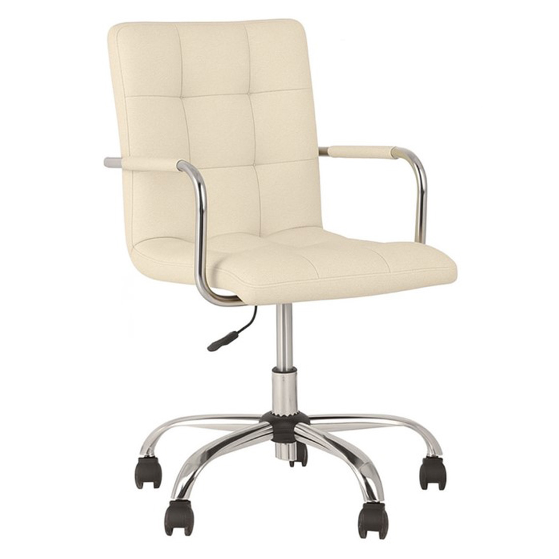 Крісло регулюється за висотою за допомогою підіймально-поворотного механізму. Хромована металева база, підлокітники з м'якими накладками, ролики з гумовим покриттям.