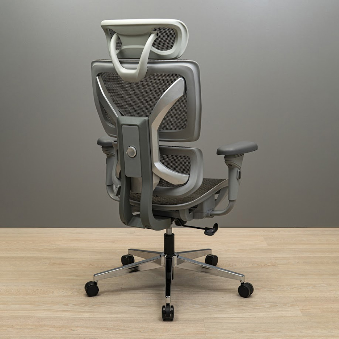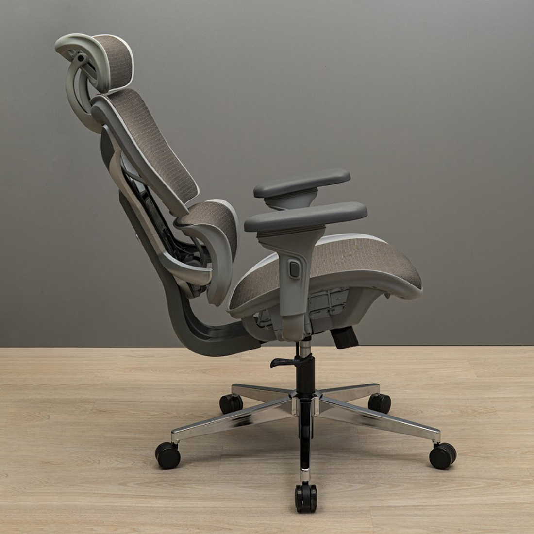 Завершує образ елегантна хромована хрестовина діаметром 720 мм з 60 мм прогумованими роликами для безпечного пересування як по плитці, так і по ламінату або паркету.