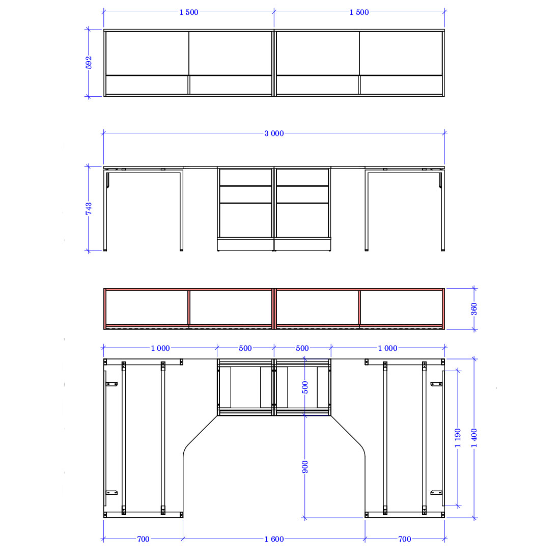 Завдяки особливій конструкції каркасу, складається враження, начебто стільниця "парить" над опорами. За бажанням замовника стільницю можна виготовити товщиною 18 або 36 мм. А опори можуть мати різні форми: Т (П-подібна форма), Q (прямокутна замкнута опора), R (трапецієвидна форма).