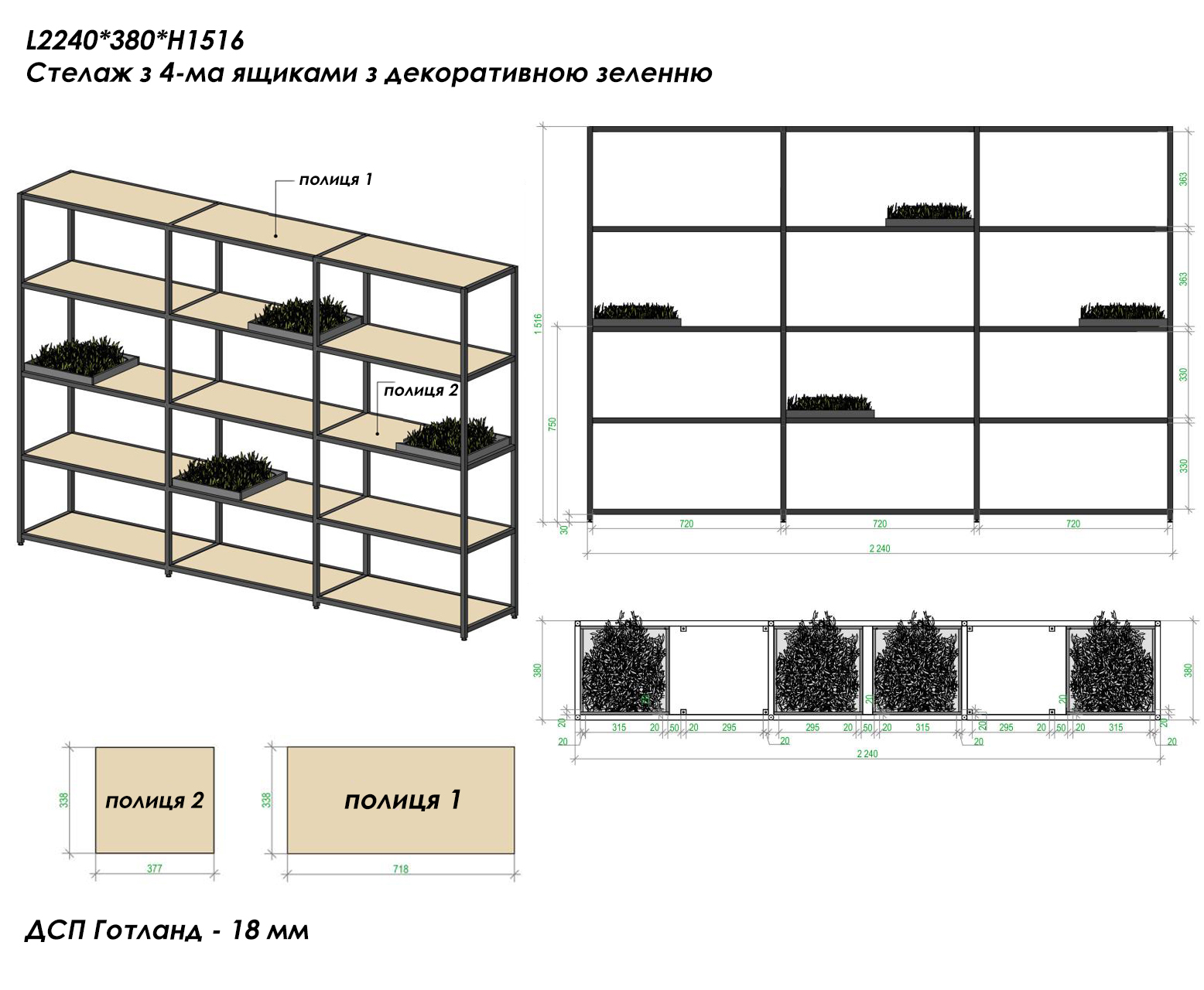 - Короб з декоративною травою — 4 шт (338*338*50h), розміщений як продовження полички.