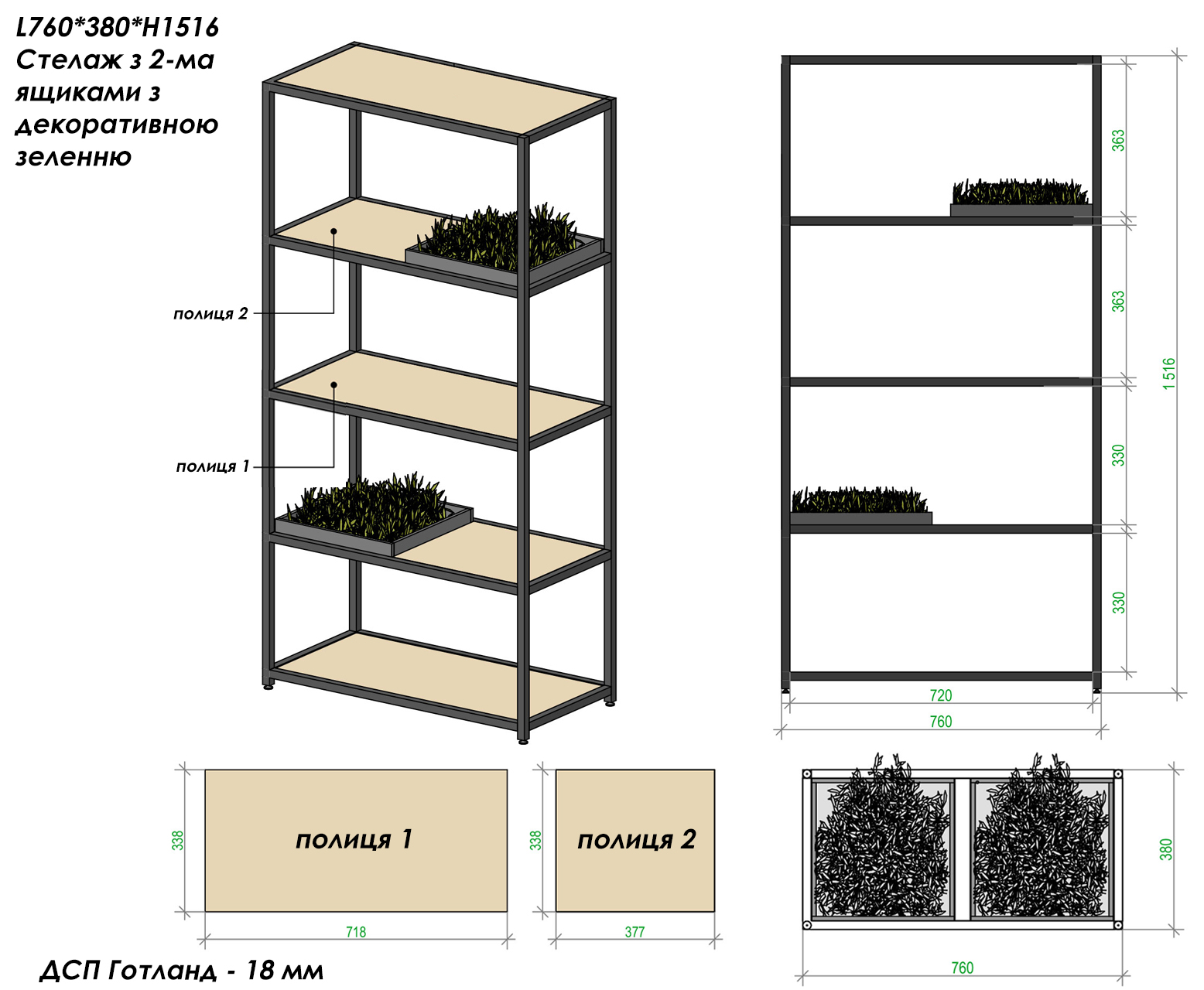 - Короб з декоративною травою — 2 шт (338*338*50h), розміщений як продовження полички.