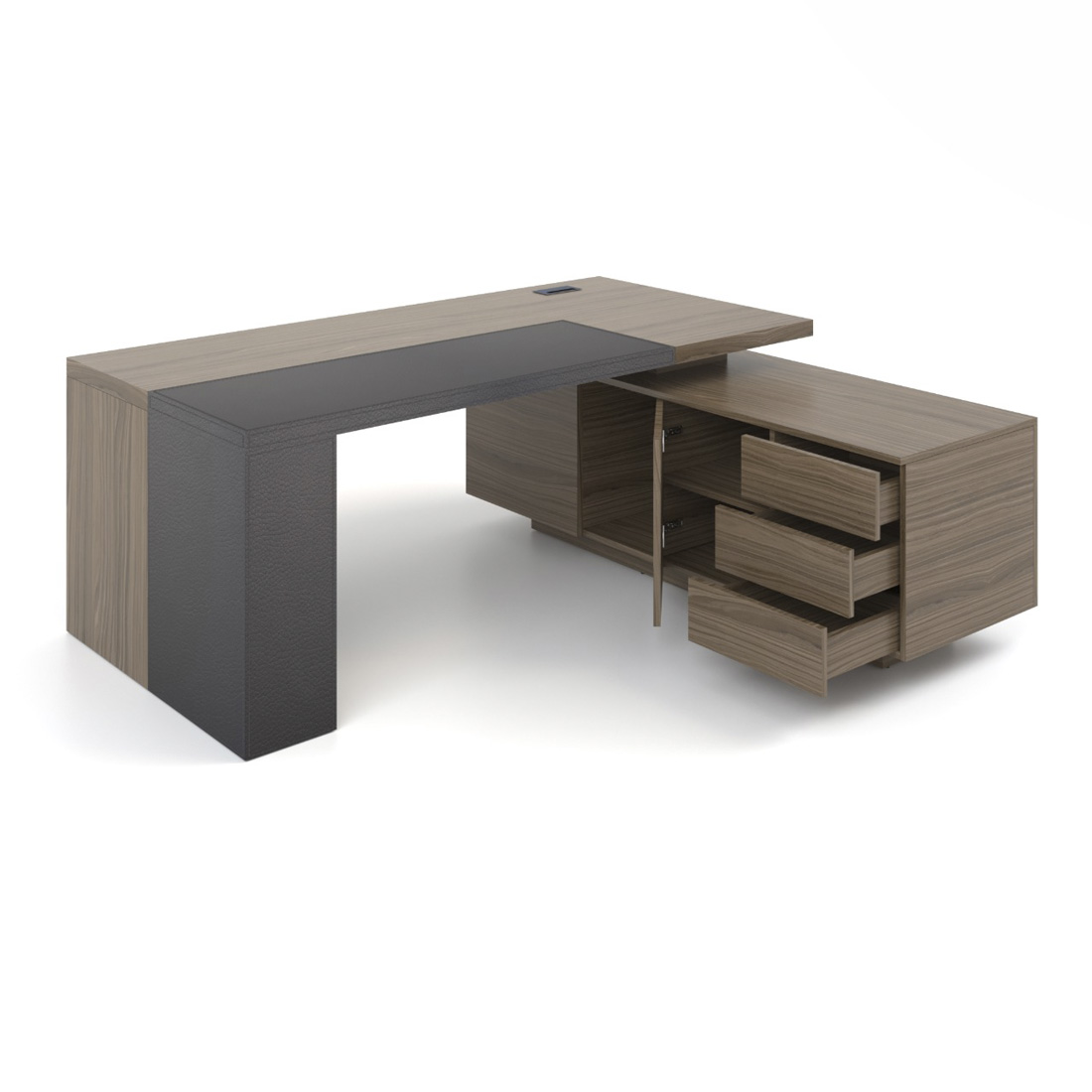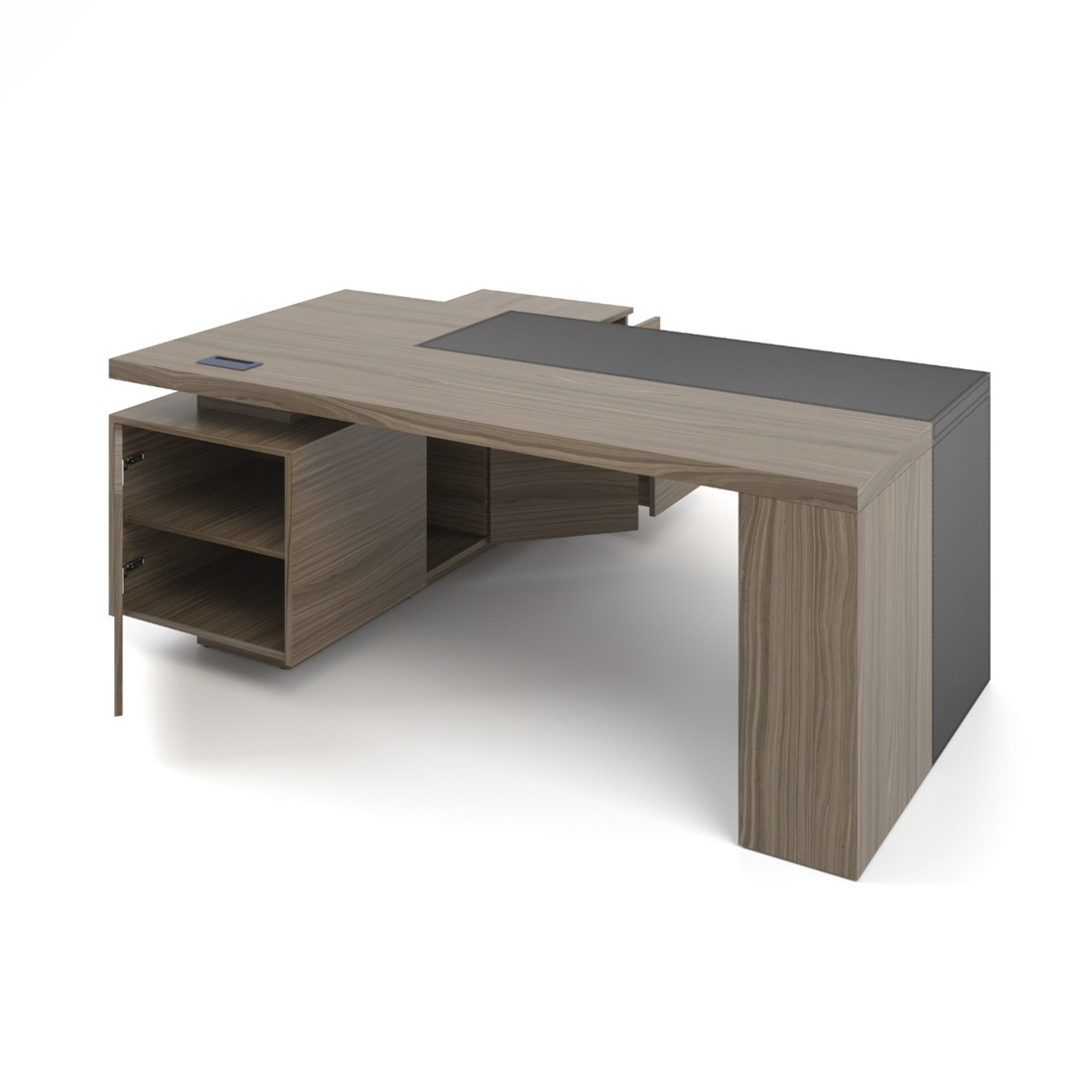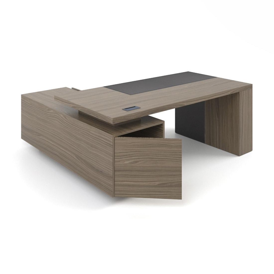 Стіл керівника має чіткі прямі лінії та масивні форми, володіє приємними тактильними властивостями, а вставка з натуральної шкіри підкреслює оригінальний дизайн та індивідуальність. Наша технологія шпонування меблів зберігає природні властивості деревини. Після покриття невеликим шаром лаку залишається виражена структура зрізу дерева, приємна та тепла на дотик.