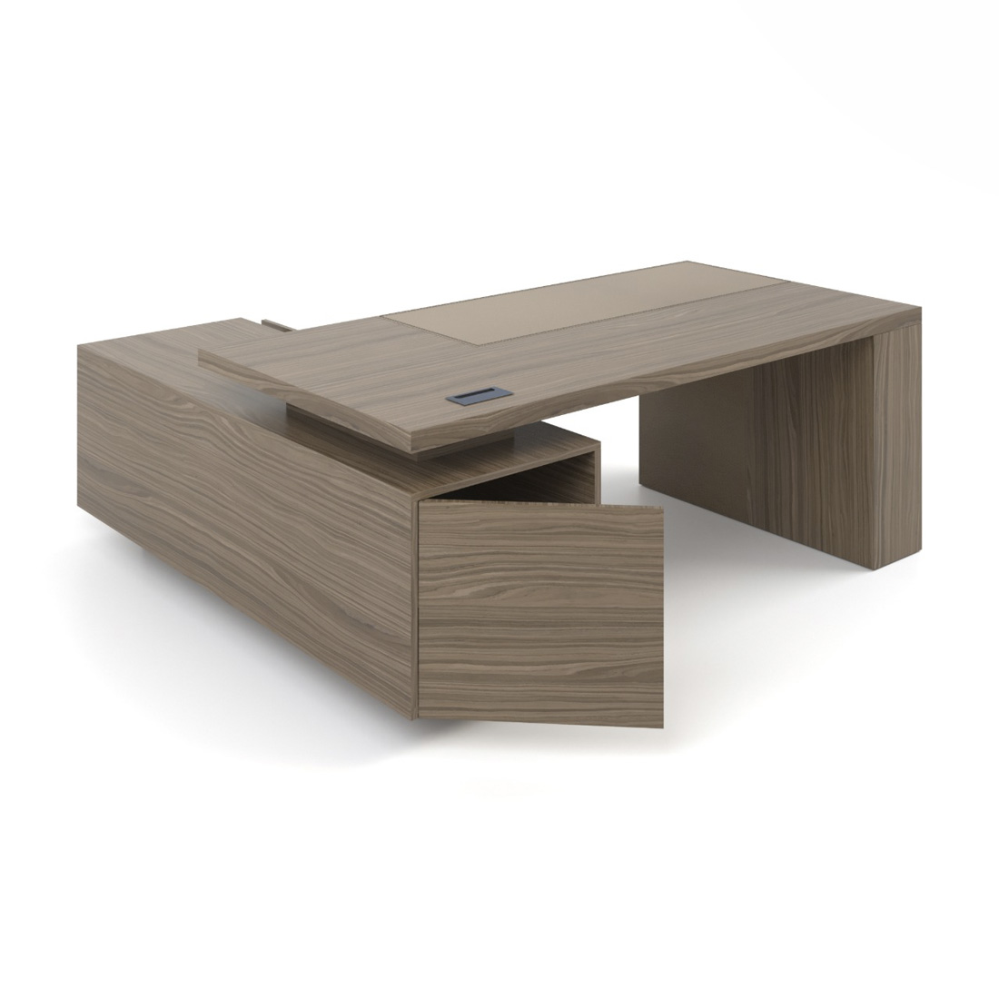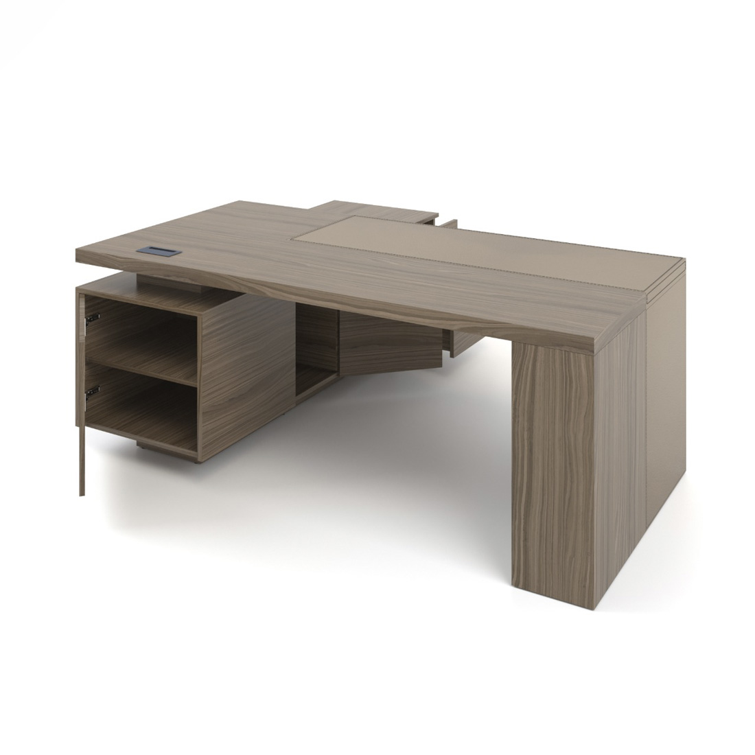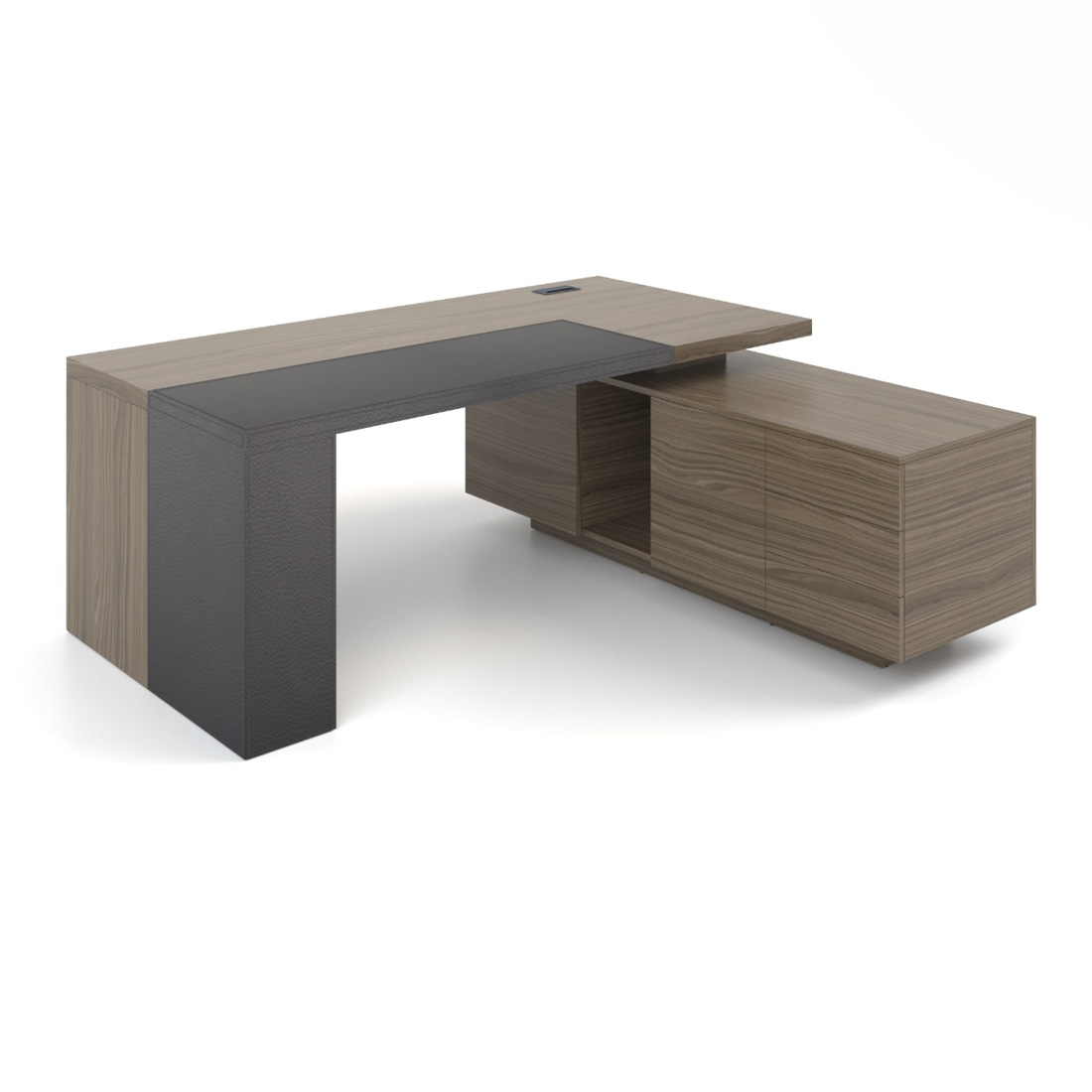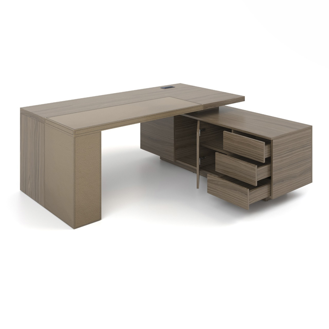 Стіл керівника має чіткі прямі лінії та масивні форми, володіє приємними тактильними властивостями, а вставка з натуральної шкіри підкреслює оригінальний дизайн та індивідуальність. Наша технологія шпонування меблів зберігає природні властивості деревини. Після покриття невеликим шаром лаку залишається виражена структура зрізу дерева, приємна та тепла на дотик.