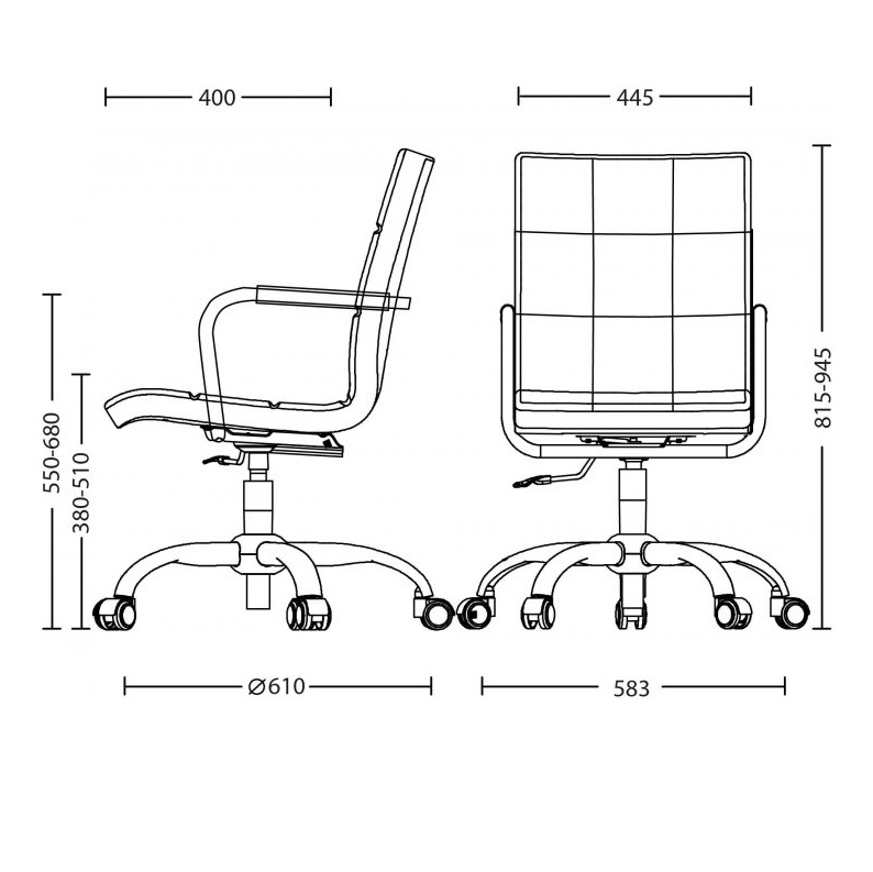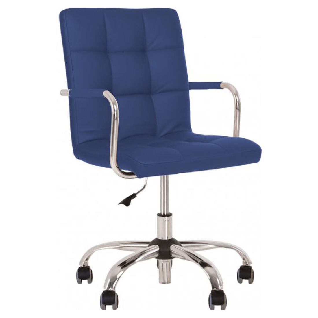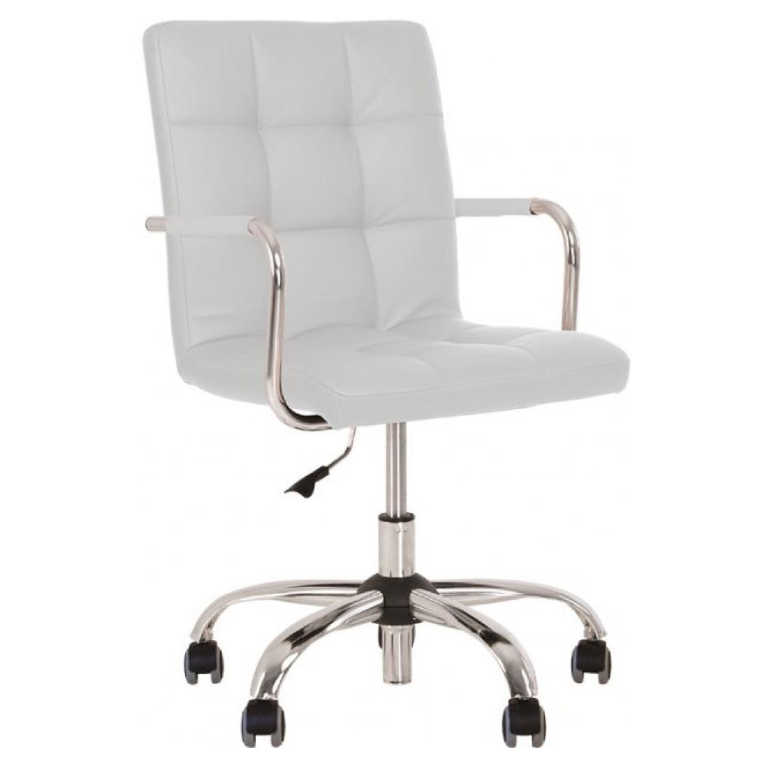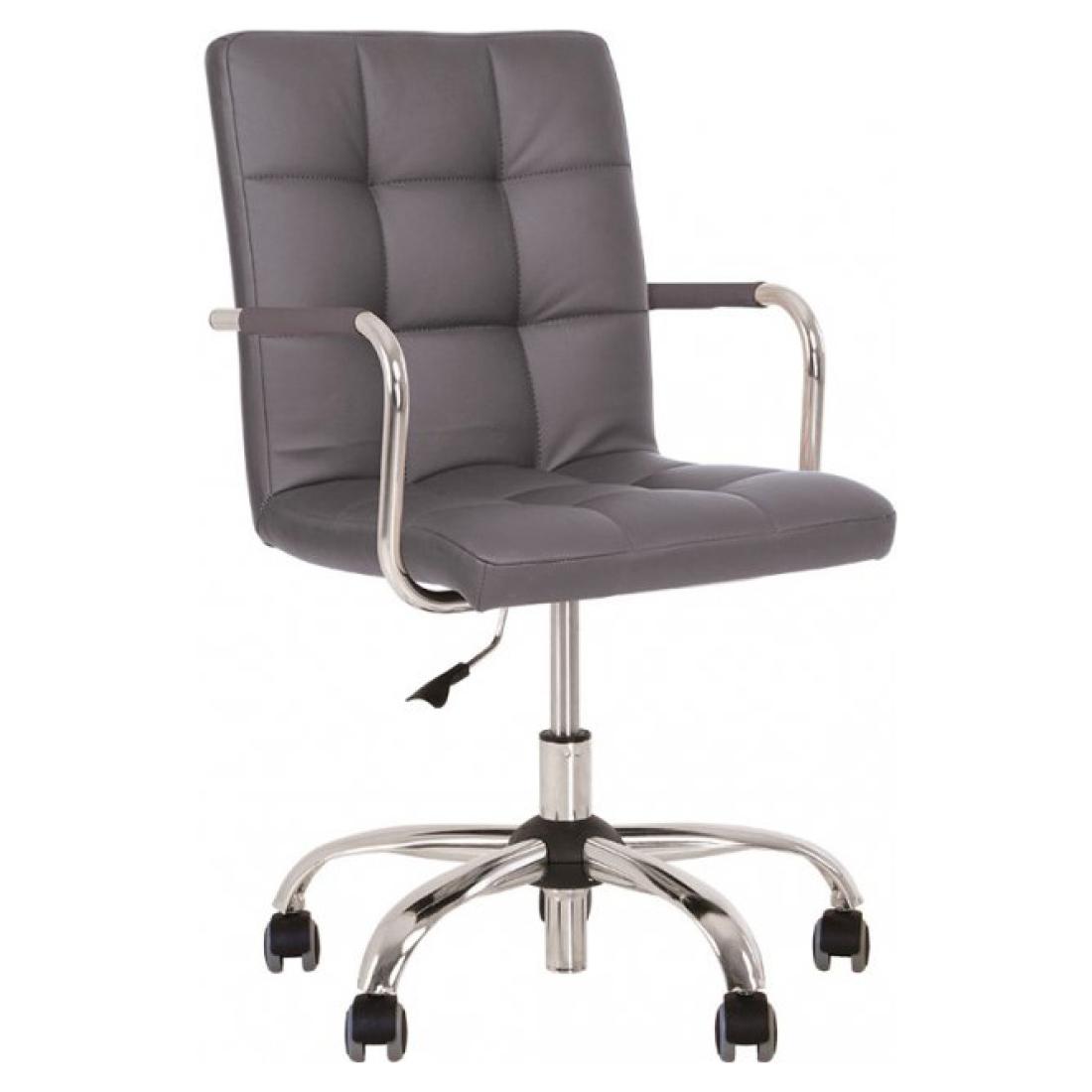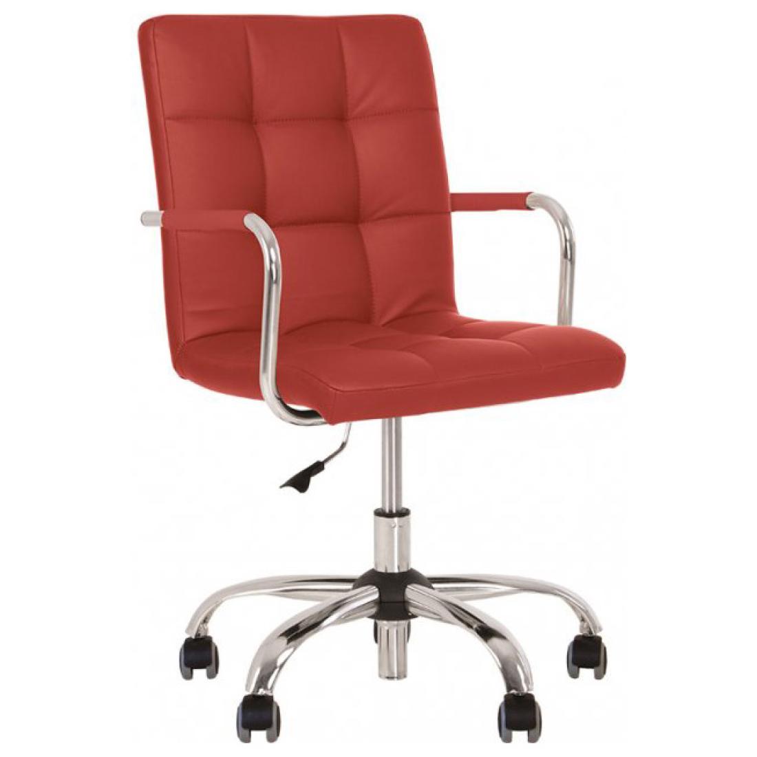 Крісло регулюється за висотою за допомогою підіймально-поворотного механізму. Хромована металева база, підлокітники з м'якими накладками, ролики з гумовим покриттям.