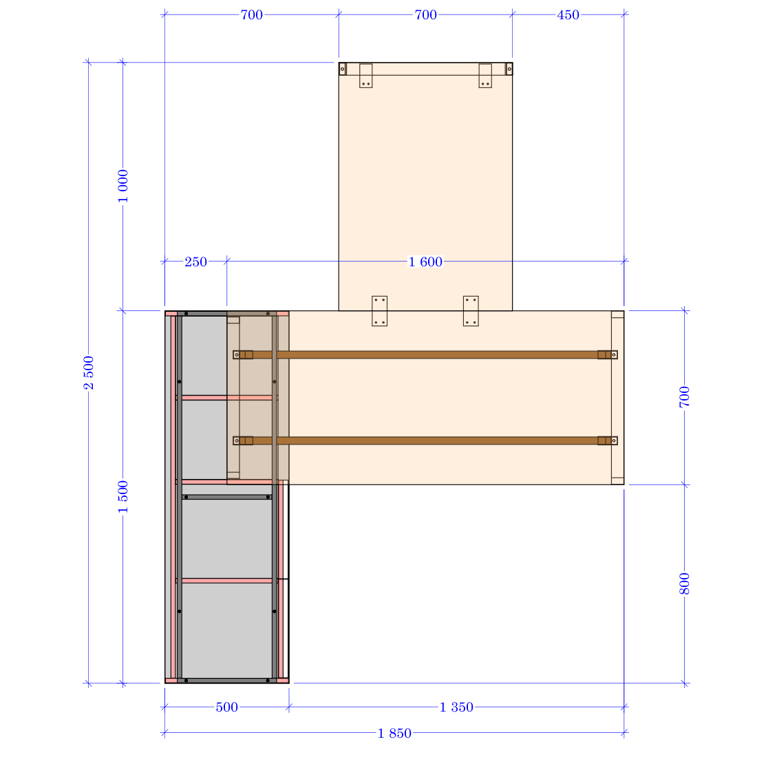 Завдяки особливій конструкції каркасу, складається враження, начебто стільниця "парить" над опорами. За бажанням замовника стільницю можна виготовити товщиною 18 або 36 мм. А опори можуть мати різні форми: Т (П-подібна форма), Q (прямокутна замкнута опора), R (трапецієвидна форма).