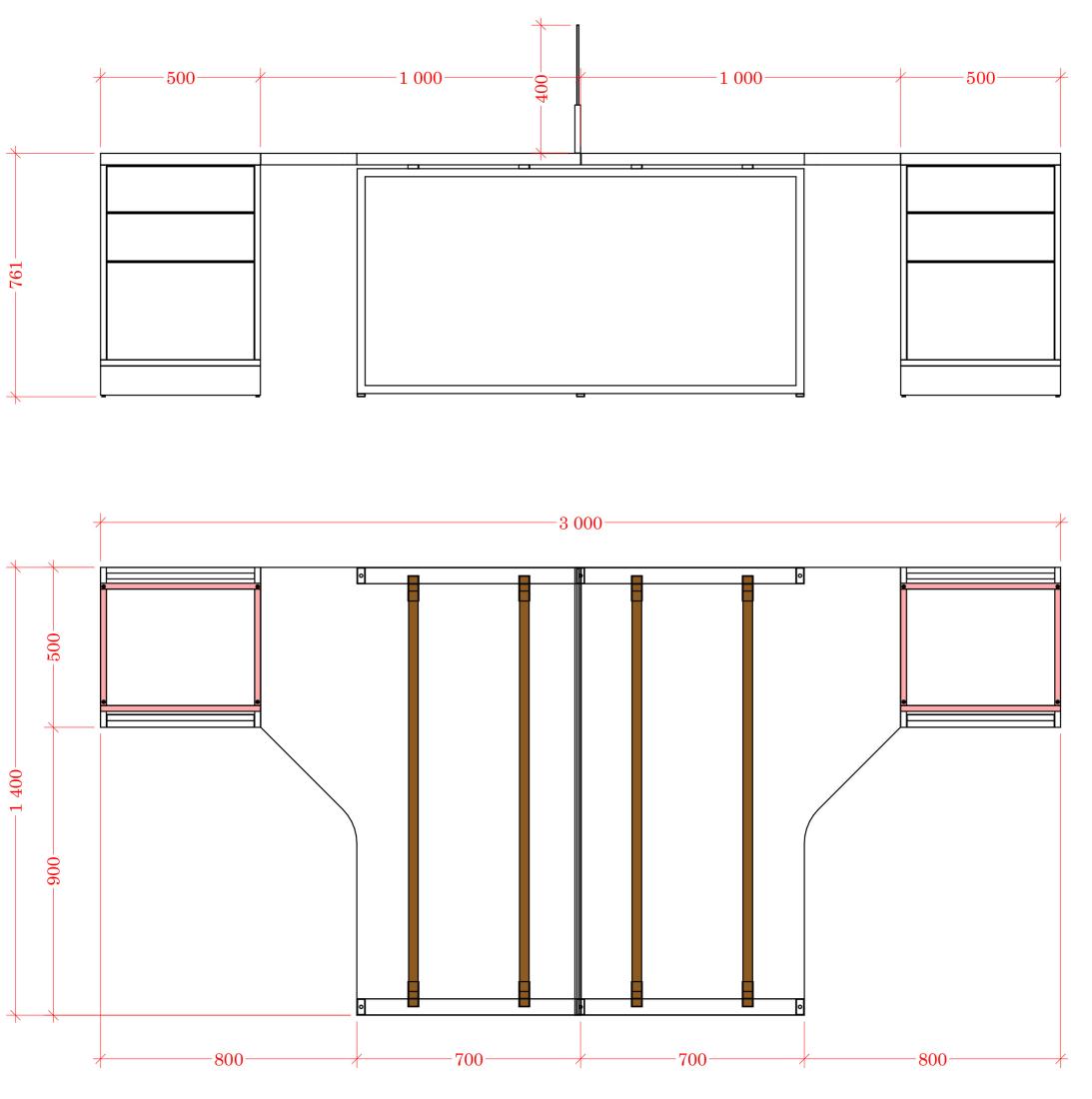 Завдяки особливій конструкції каркасу, складається враження, начебто стільниця "парить" над опорами. За бажанням замовника стільницю можна виготовити товщиною 18 або 36 мм. А опори можуть мати різні форми: Q (прямокутна замкнута опора), R (трапецієвидна форма), Т (П-подібна форма).