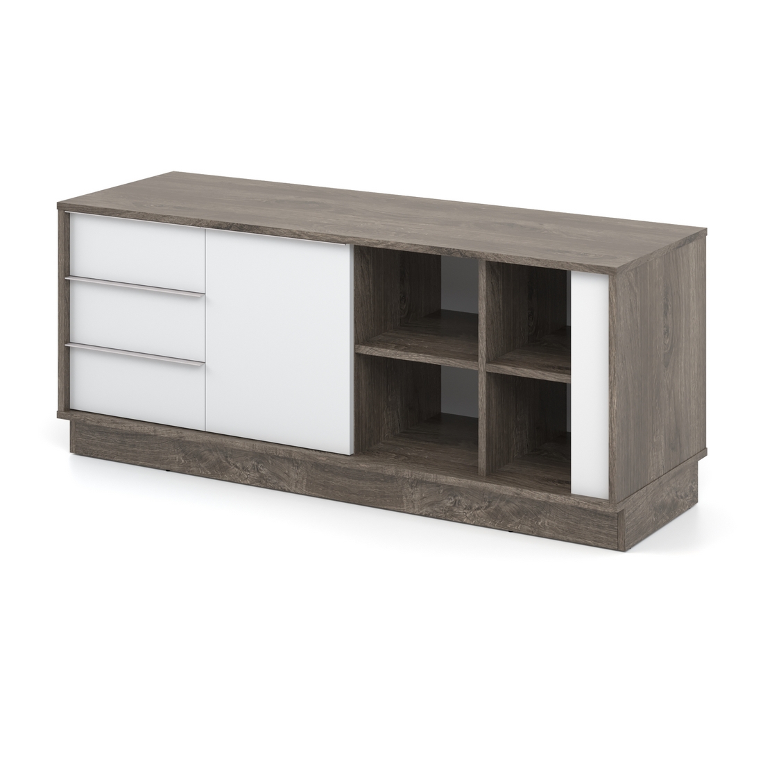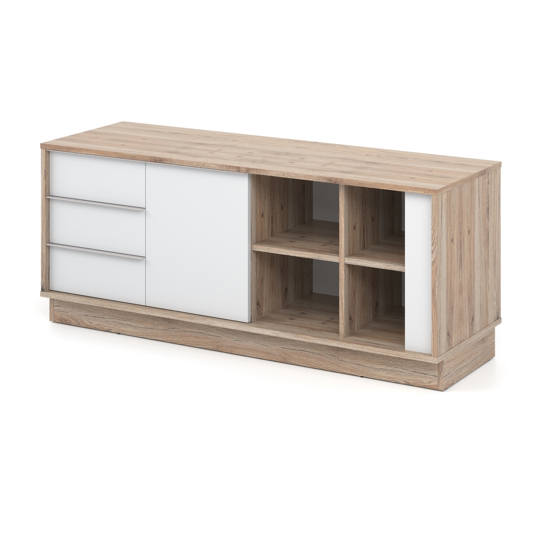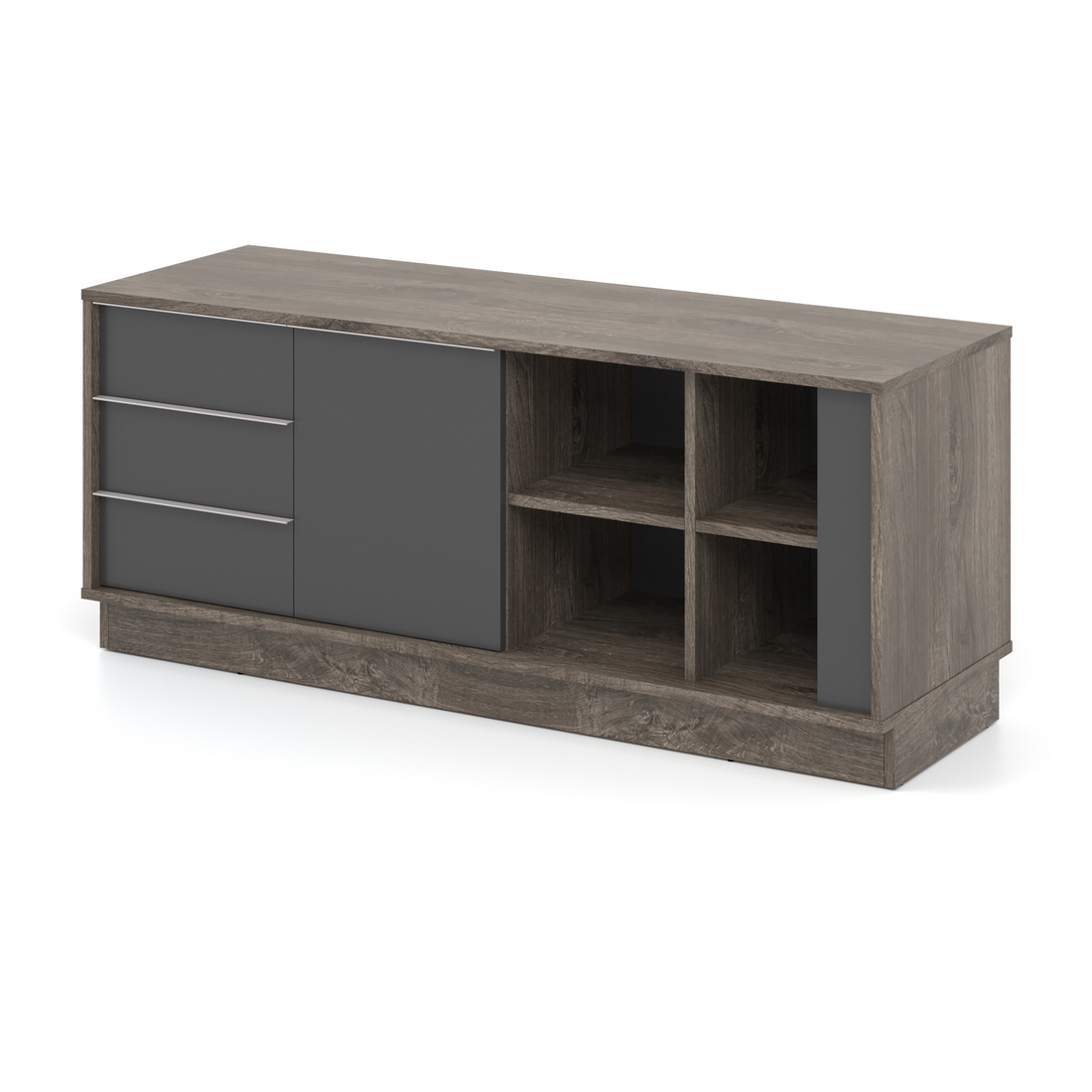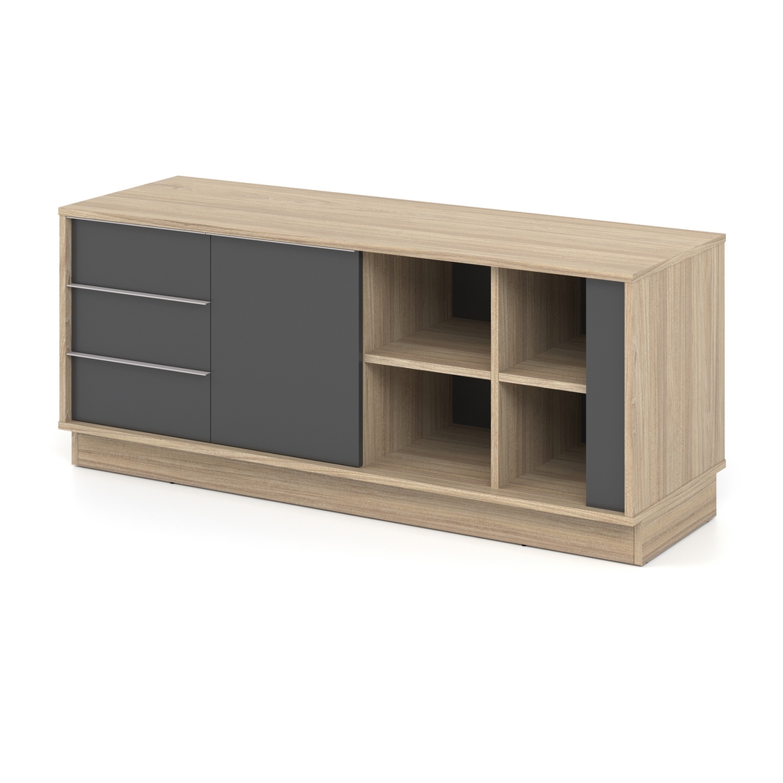- В тумбі 2 закриті полиці, одні дверцята, 3 висувні шухляди та 4 відкриті полиці.