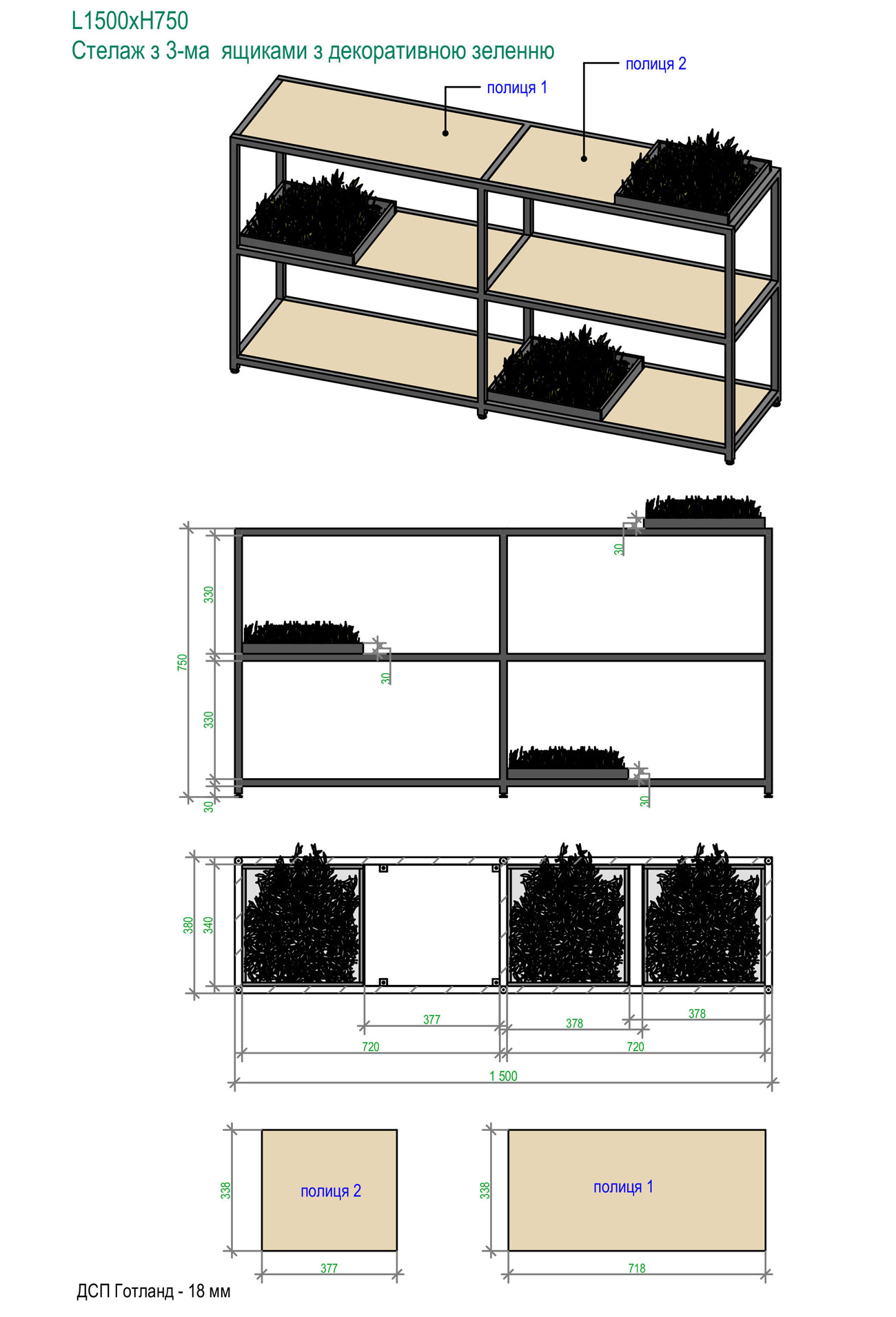 - Короб з декоративною траваю — 3 шт. (338*338*50h розміщений як продовження полички).