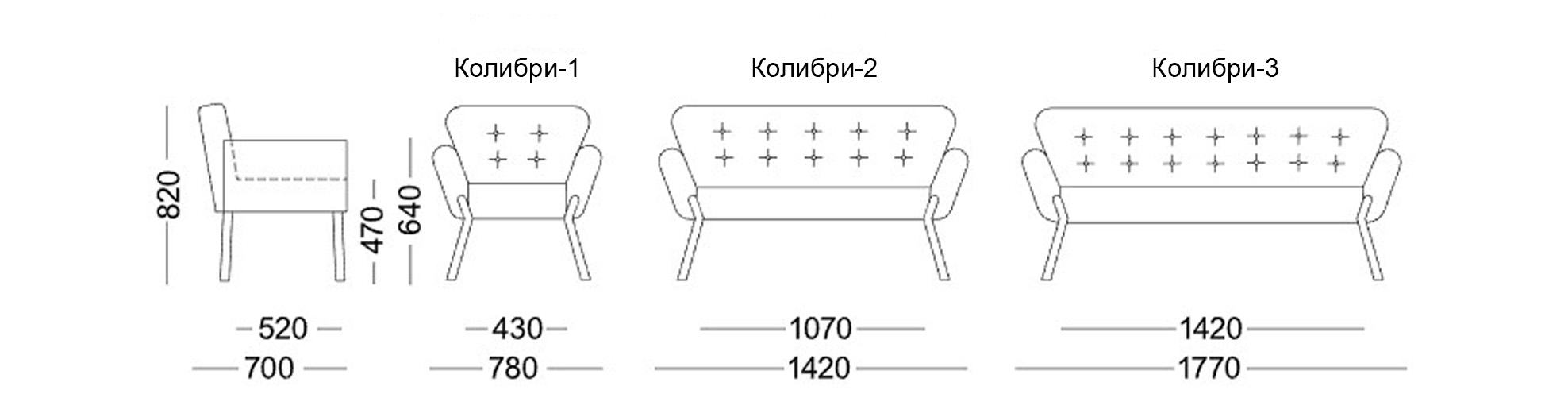 Кресло Колибри – это универсальная модель с оригинальными высокими ножками из нержавеющей стали. Они придают ему устойчивость и визуальную лёгкость. Разлёт подлокотников повторяет трапециевидную форму наклонённой спинки, декорированной втяжками с пуговицами.