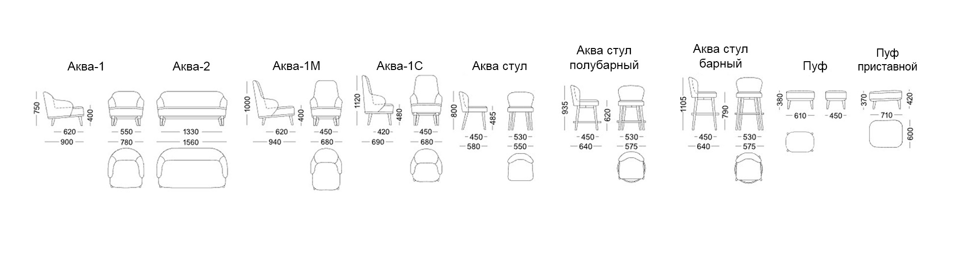 Серия Аква – одна из самых ярких образцов дизайнерской мебели в каталоге. Она отличается лаконичными и плавными линиями, спокойной цветовой гаммой и приятной фактурой обивки. В модели воплощены современные мебельные тенденции. Отсылка к ненавязчивой элегантности 50-х присутствует в мягком силуэте и продуманных деталях. Конструкция поддерживается опорами из дерева – утонченными, но устойчивыми. Диван или кресло идеально дополнит интерьеры в стиле модерн, ар-деко, ретро и других направлениях.