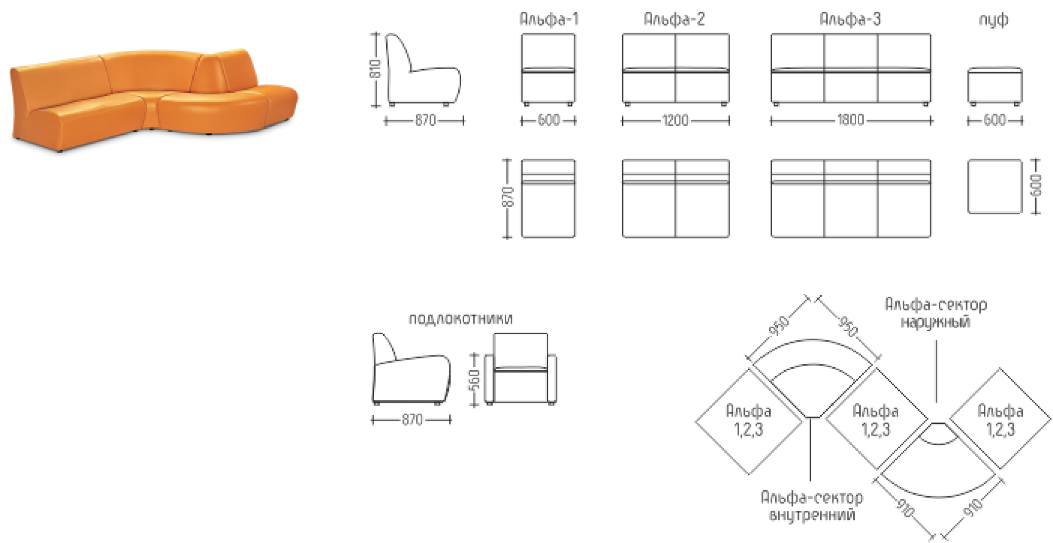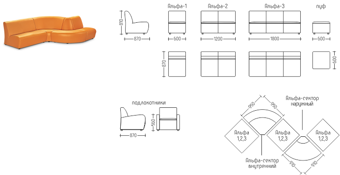 Серия состоит из кресла, двух-, трёхместного дивана, внутреннего и внешнего соединительного сектора, пуфа и подлокотников. Разнообразие элементов позволяет заполнять любое помещение, окружать колонны, создавать неповторимую композицию. Зигзагообразный, квадратный или полукруглый диван? Запросто – в этой коллекции все ограничивается только вашей фантазией.