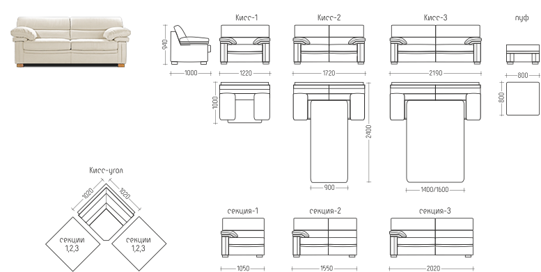 В серии широкий ассортимент всех типов обивки – из натуральной или искусственной кожи, ткани. Доступны различные оттенки – вы можете подобрать идеальный тон, созвучный вашему настроению. Аккуратные опоры сделаны из натурального дерева. Они не слишком заметны, но, если вы захотите акцентировать внимание на ножках, поможет интересный или контрастный цвет лака. Серия состоит из кресла, двух-, трёхместного дивана, одно-, двух-, трёхместной секции, соединительного элемента «угол» и пуфа.