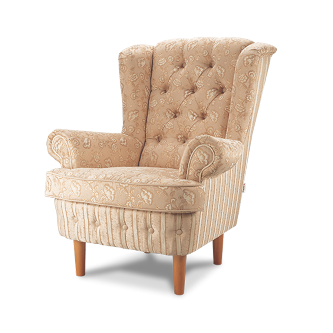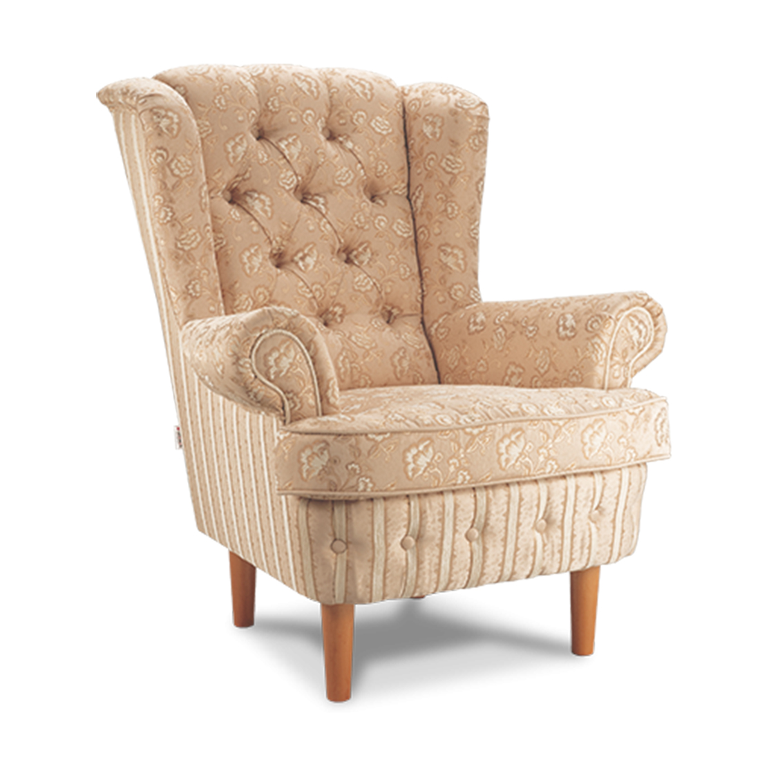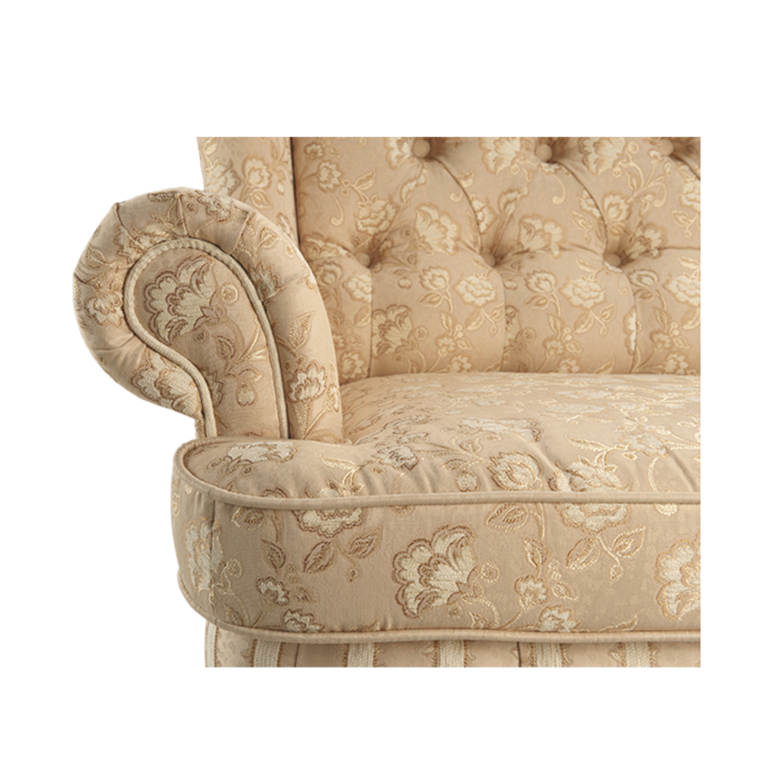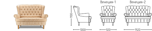 Кресло Венеция-1 DLS - Элегантный диван Венеция отличается ярко выраженным наклоном спинки. Стройные опоры из натуральной древесины поддерживают мягкую часть дивана, плавная линия спинки очерчивает изящный силуэт. Классическая техника «капитоне», применённая на передней части спинки, отлично сочетается с орнаментом обивки. Применение в обивке тканей-компаньонов подчёркивает конструктивные особенности дивана. Оригинально закрученный подлокотник, лицевая часть спинки и выступающая подушка сиденья, украшенные орнаментом, выгодно оттеняются ритмичными полосами основы дивана. Края подушки окантованы декоративным шнуром. Передняя часть царги дополнительно украшена складками с пуговицами. Серия состоит из кресла и двухместного дивана.