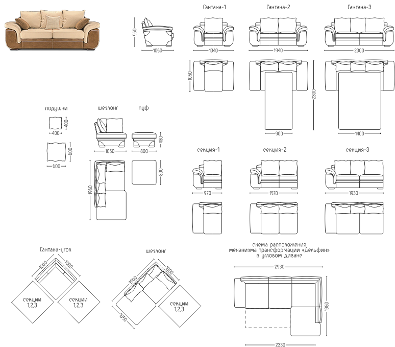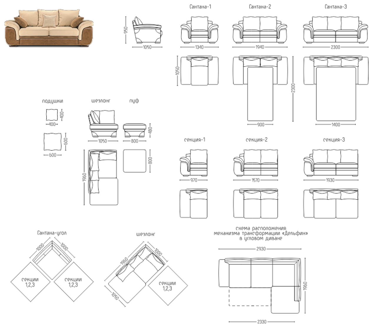 Серия состоит из кресла, двух-, трёхместного дивана, одно-, двух-, трёхместной секции, шезлонга, соединительного углового элемента и пуфа. По вашему желанию мы встроим механизм трансформации «Мералат», а в угловой вариант — «Дельфин».