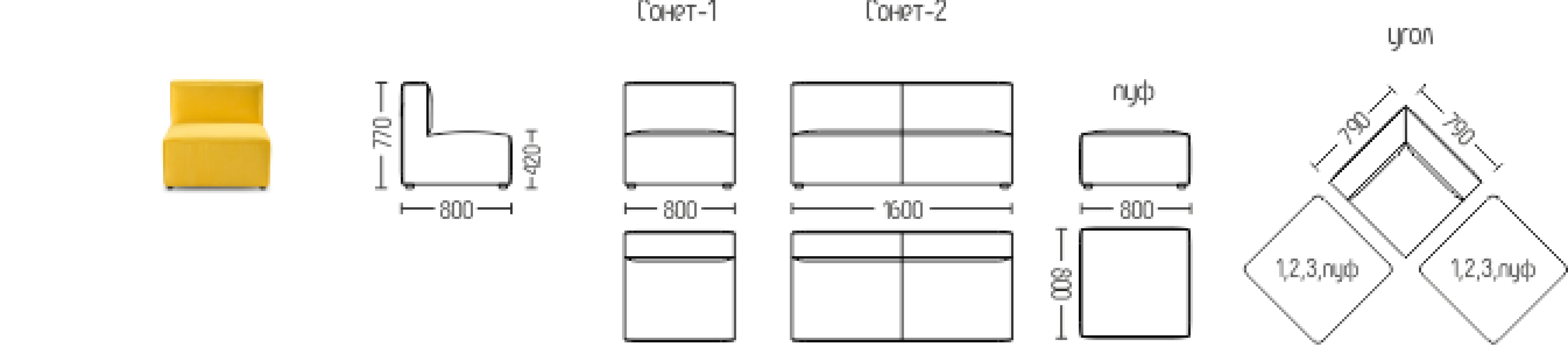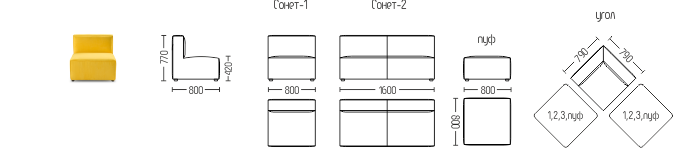 Серия состоит из двухместного дивана, соединительного углового элемента, кресла и пуфа. Лаконичный дизайн позволяет мебели раскрыться с функциональной стороны. Оригинальные модификации с углами или без них обычный диван модульный превращают в уникальный инструмент дизайнера.