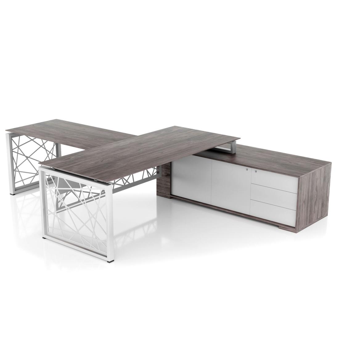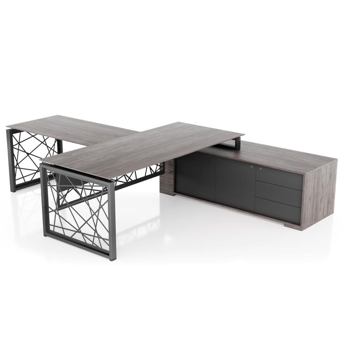 Кабінет Rays / Рейз має чіткі форми, прямі лінії і стильний лаконічний дизайн. У виготовленні даного кабінету ми використали матеріал Egger ЛДСП і метал. Особливість меблів Rays - ексклюзивні металеві опори з хаотичними променями. Стіл має міцний металевий каркас, а стільниця виконана в двох варіантах - гартоване скло або ЛДСП на вибір. Сучасний дизайн меблів Rays - це відмінне рішення для облаштування модного офісу керівника в європейському стилі. Серія включає все необхідне для оформлення кабінету і переговорної зони: столи, мобільні і приставні тумби, шафи.