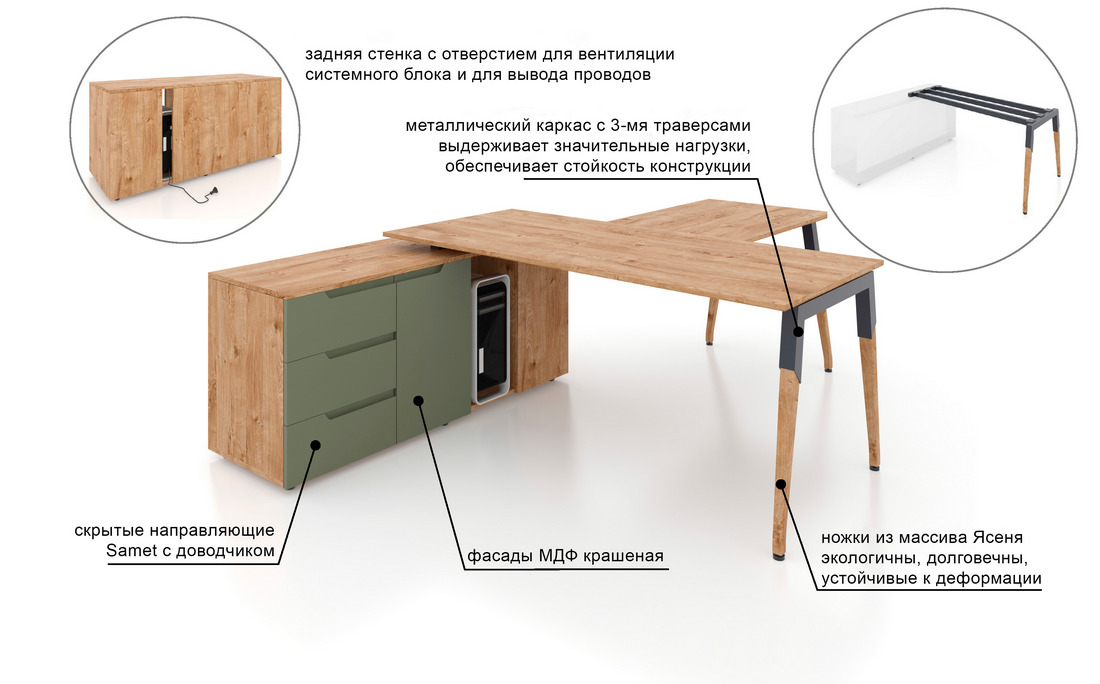 - Столешницы и корпуса всех изделий (кроме коробов конференц столов) выполнены из ДСП толщиной 18 мм (задняя стенка также ДСП 18 мм).