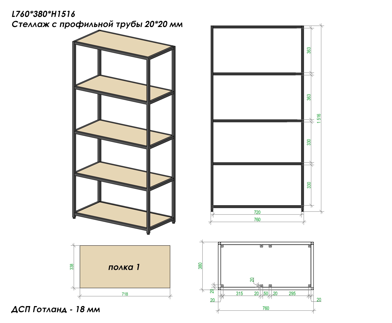 | Дополнительные характеристики | Толщина трубы каркаса - 20*20 мм, полки - ДСП 18 мм |