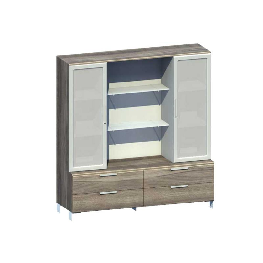 Шкафную группу можно поделить на 2 части - тумбу с ящиками и надстройку.