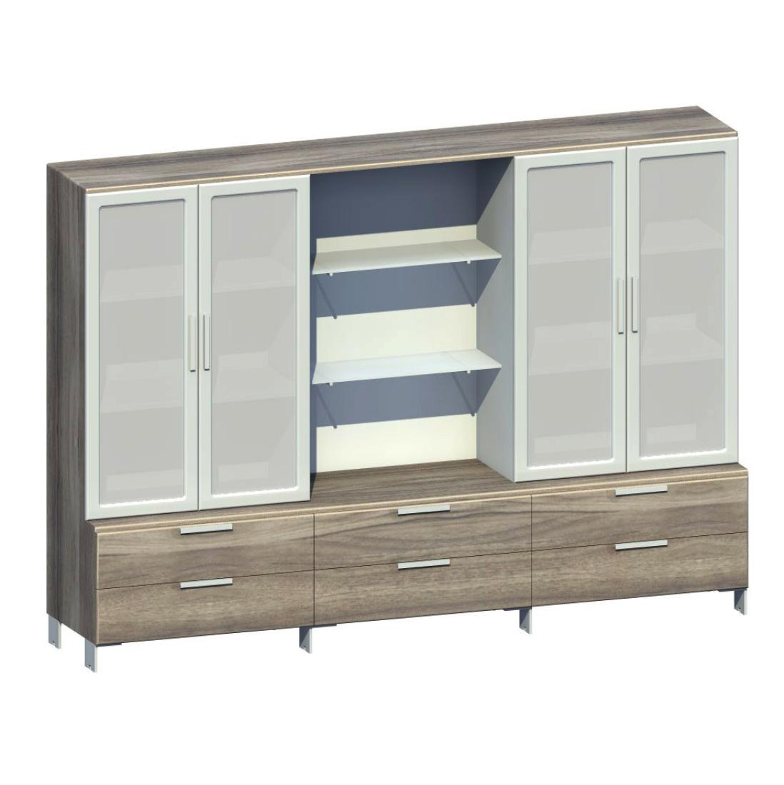 Шкафную группу можно поделить на 2 части - тумбу с ящиками и надстройку.
