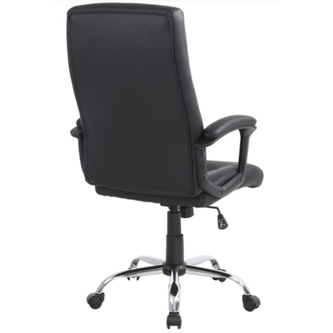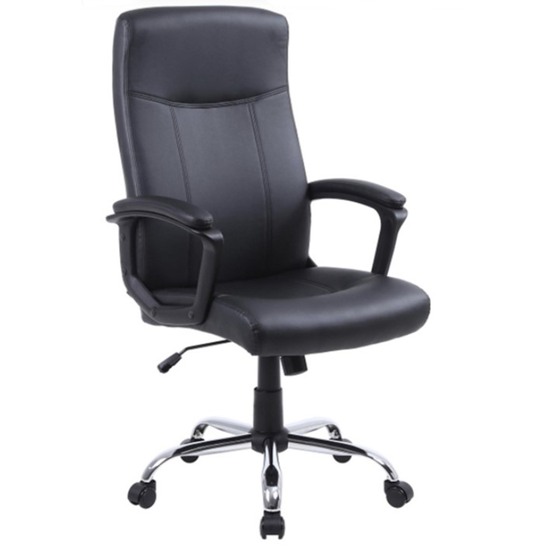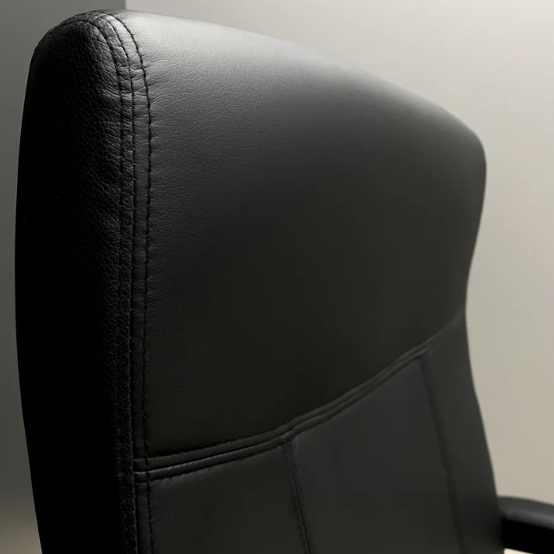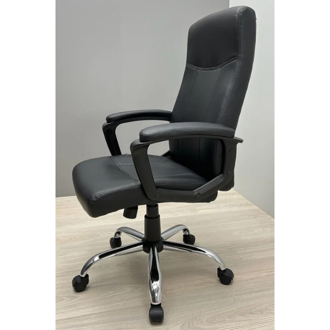 Обивка кресла изготовлена из качественного черного кожзама, что не только обеспечивает долговечность и простоту в уходе, но и придает эстетически привлекательный внешний вид. Пластиковые подлокотники, усиленные металлическими закладными, дополнены мягкими накладками для обеспечения комфорта во время продолжительного использования.