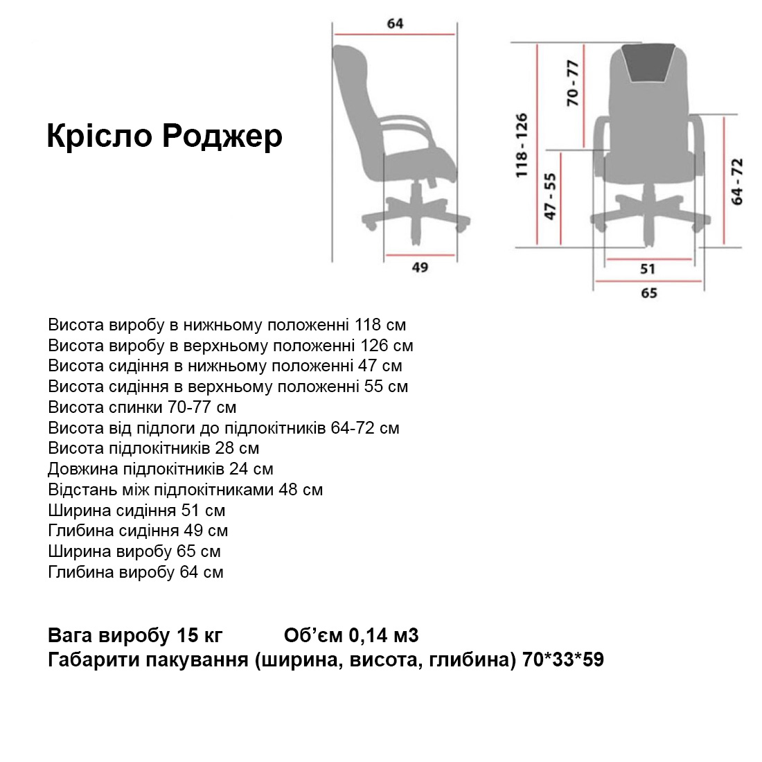 Кресло имеет оптимальные габариты и подходит для людей различной комплекции. Его ширина составляет — 650 мм, глубина — 480 мм, а высота — 1180-1260 мм.