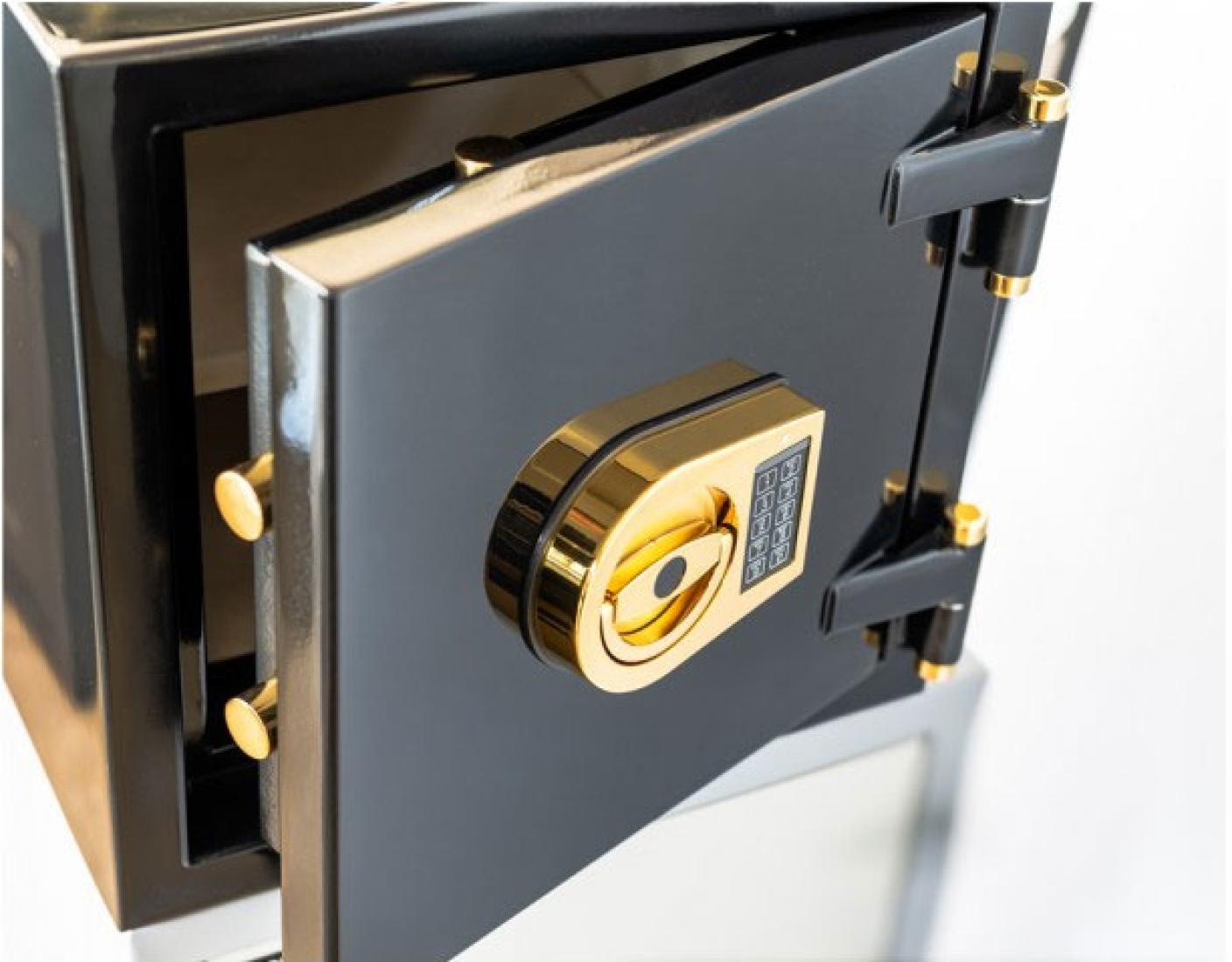 Корпус и двери сейфа F.30 CLI.35.E BLACK GOLD заливаются огневзломостойким бетоном толщиной 55 мм, а встроенная ригельная система отличается трехсторонней защитой, представленной кодовым замком M-LOCKS или ключевым STUV и немецкой термолентой BASF.
