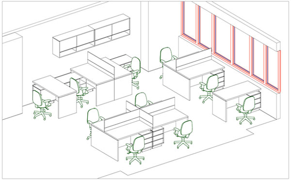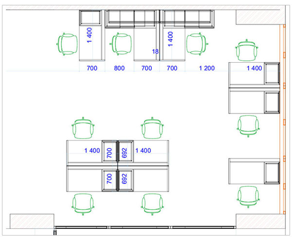 Благодаря плану Вы сможете визуально представить интерьер офиса и учесть все нюансы расстановки мебели: габариты рабочих мест, расположение шкафов и др.